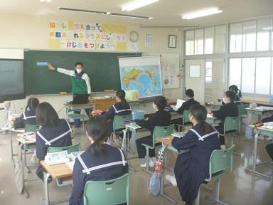 1年生は、社会です。教科担当の先生が、「本時の目標」を示しているところです。授業の約束事にも少しづつ慣れてきて、本格的に学習を進めています。