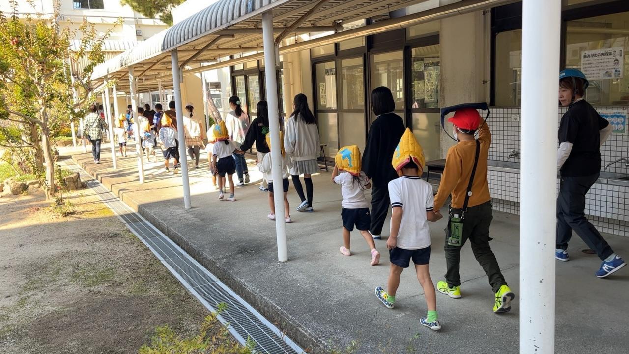 小学校との防災訓練。津波がきた時を想定して、6年生のお兄さんお姉さんと一緒に小学校の3階まで登りました❗