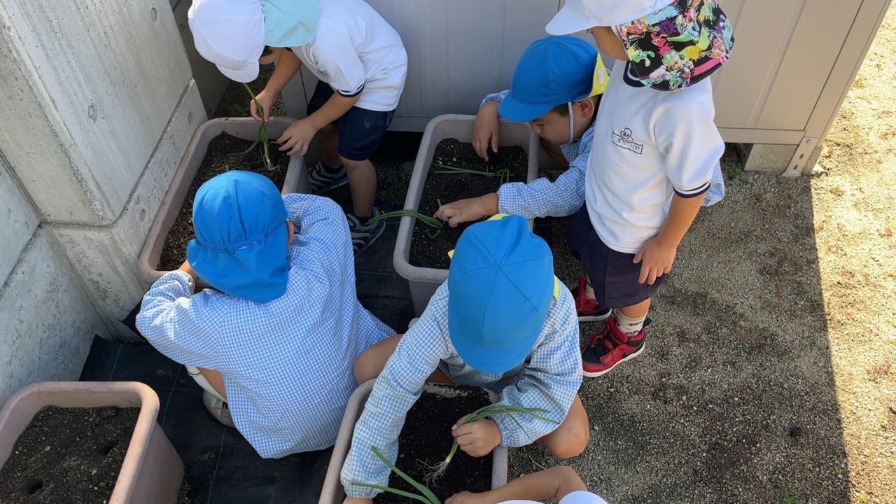 玉ねぎの苗植え。「ねっこを下に植える〜」「白いところが大きくなるんやで〜」玉ねぎの植え方、よく知ってるね✨