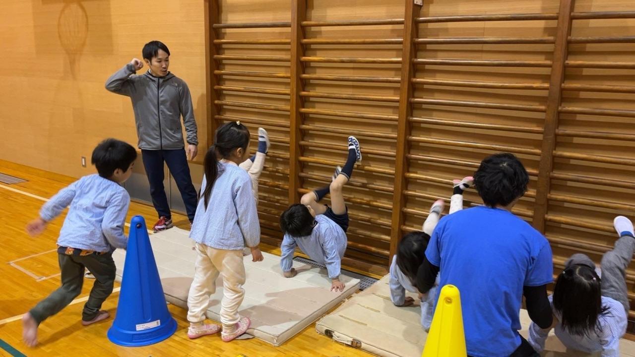 今回が最後となった体操教室!体の動かし方、跳び箱や鉄棒のコツを楽しく教えてもらいました。沖口先生のバク転はすごかったね💪 子どもたちの目がキラキラ輝いていました✨