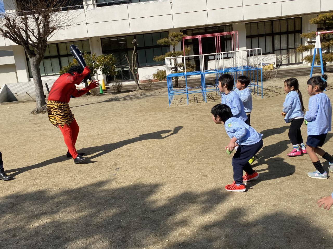 豆まきをしていると、赤鬼が登場!後ずさりをしていた子も勇気をだして悪い鬼を退治しました!みんなの中にいる「泣き虫鬼」「おこりんぼ鬼」もやっつけましたよ😆