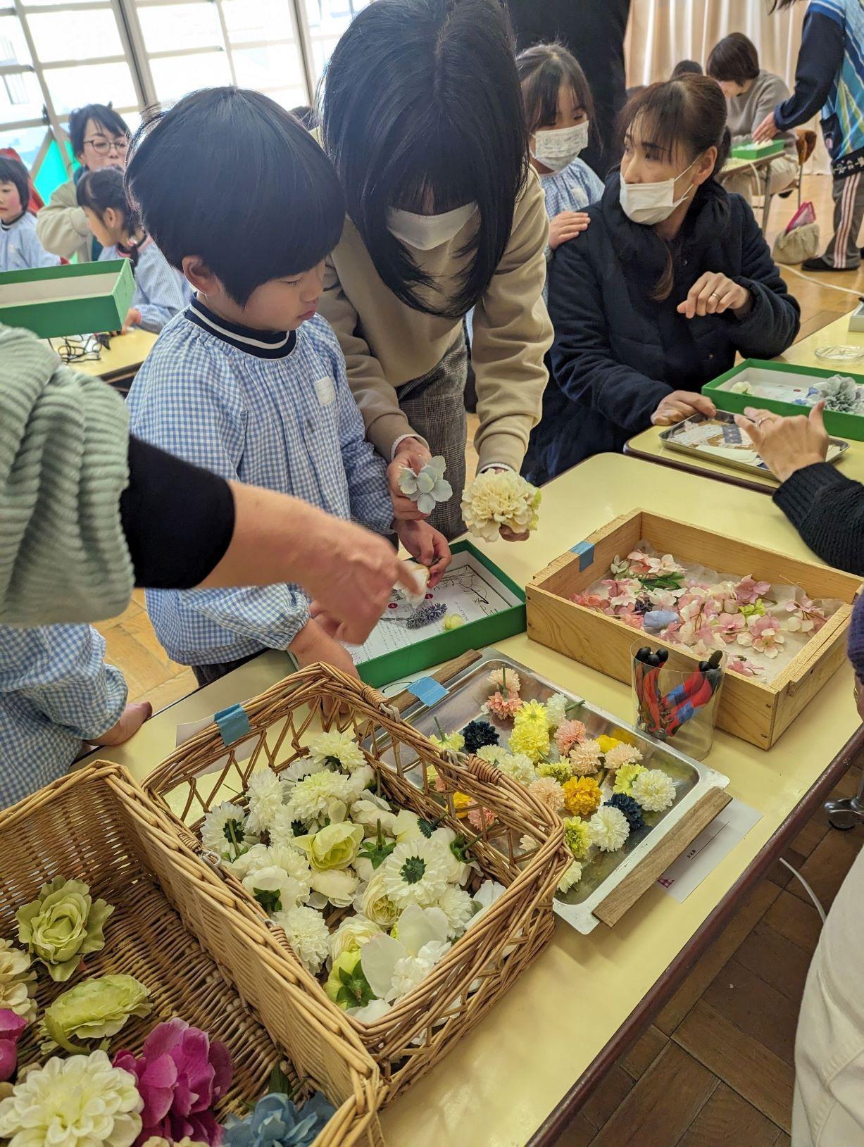 5歳児親子でコサージュ作りをしました。親子で色を合わせたり「これ、ママに合う!」とお母さんの花を選んであげたりして、それぞれ素敵なコサージュが出来上がりました✨修了式につけるのが楽しみですね🌹