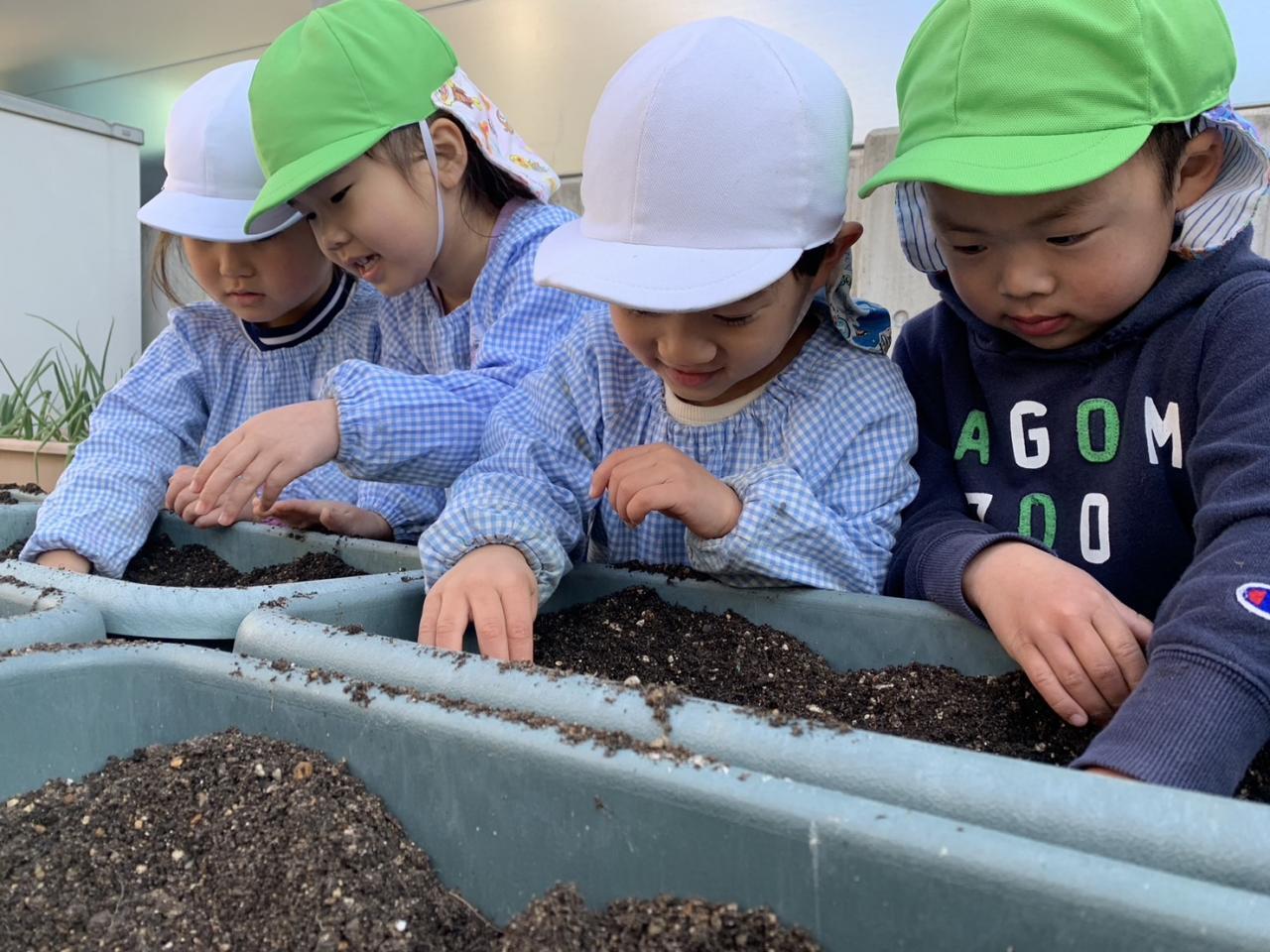 うさぎ組・ひよこ組がじゃがいもの種イモを植えたよ✨進級する頃には、じゃがいもさんもおおきくなるかな!?