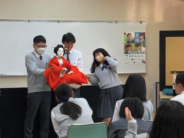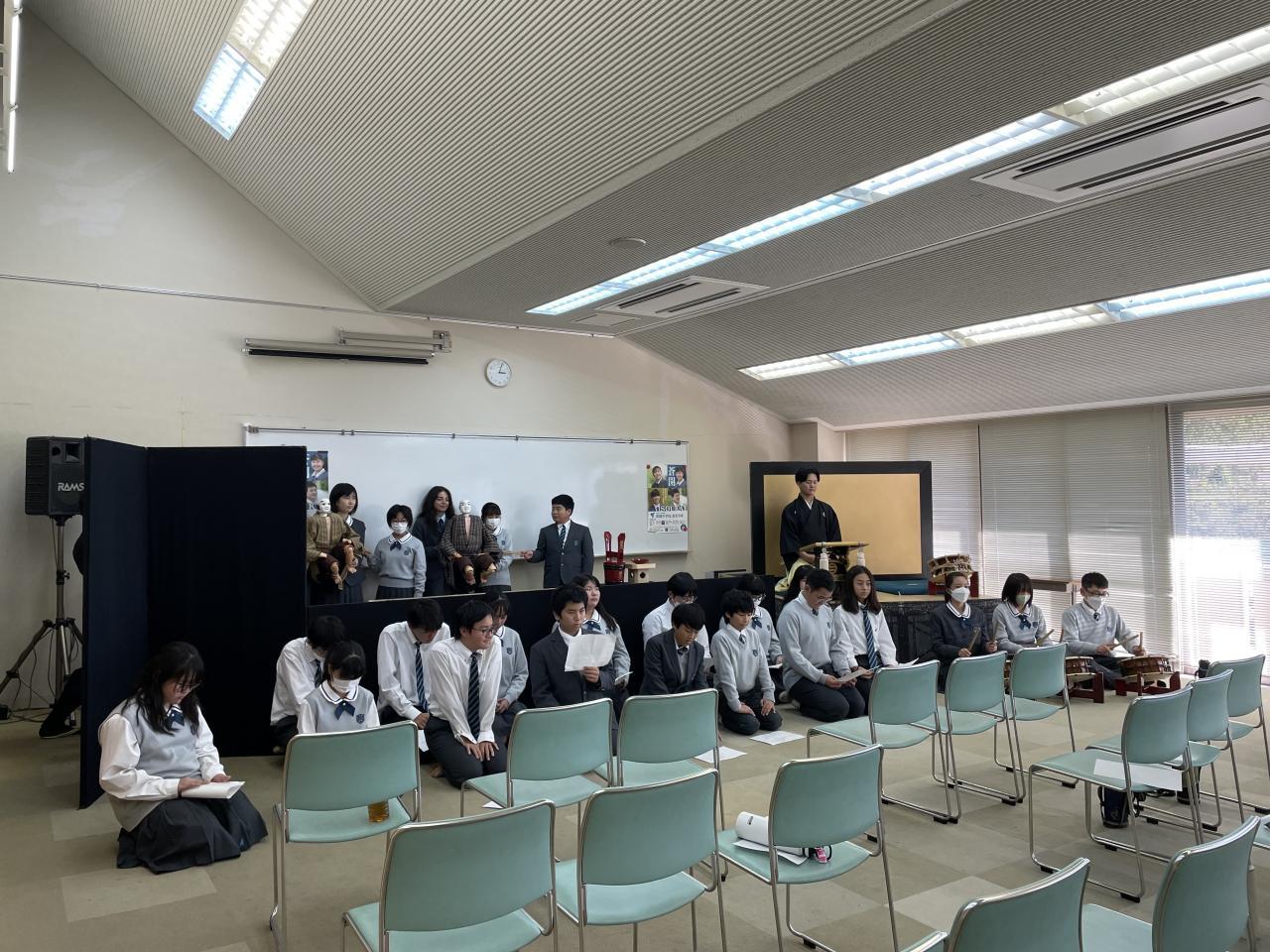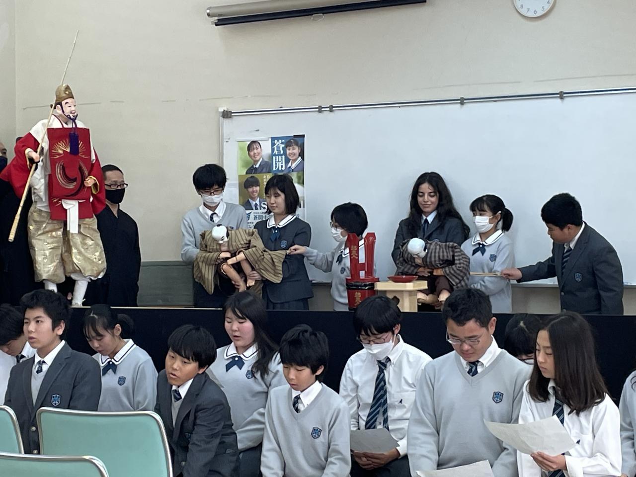 11/20(月)21(火)の2日間、淡路人形座の方々に来ていただき、中1生たちに人形浄瑠璃の歴史や特徴についてお話しいただきました。2日目は、生徒たち自身が、「太鼓」「太夫」「人形遣い」の3パートに分かれて練習した後、世界平和を祈願して「えびす舞い」を披露しました。