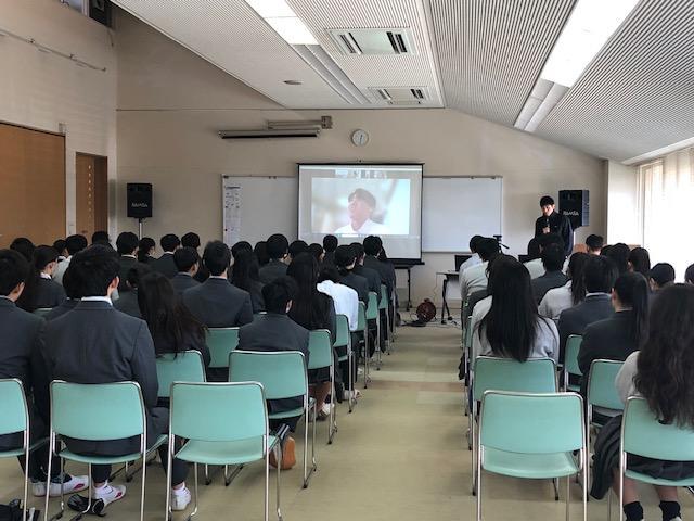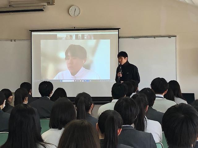 本日4時間目、現在大学2回生の先輩方3名をゲストスピーカーに招き進路講演会を行いました。事前に実施したアンケートで要望の多かった、大学での勉強やアルバイトの話に始まり、「いつ頃進路を決定したか」や、「苦手科目にどのように取り組んだか」、また各教科・科目の勉強法などについて具体的に話してくれました。