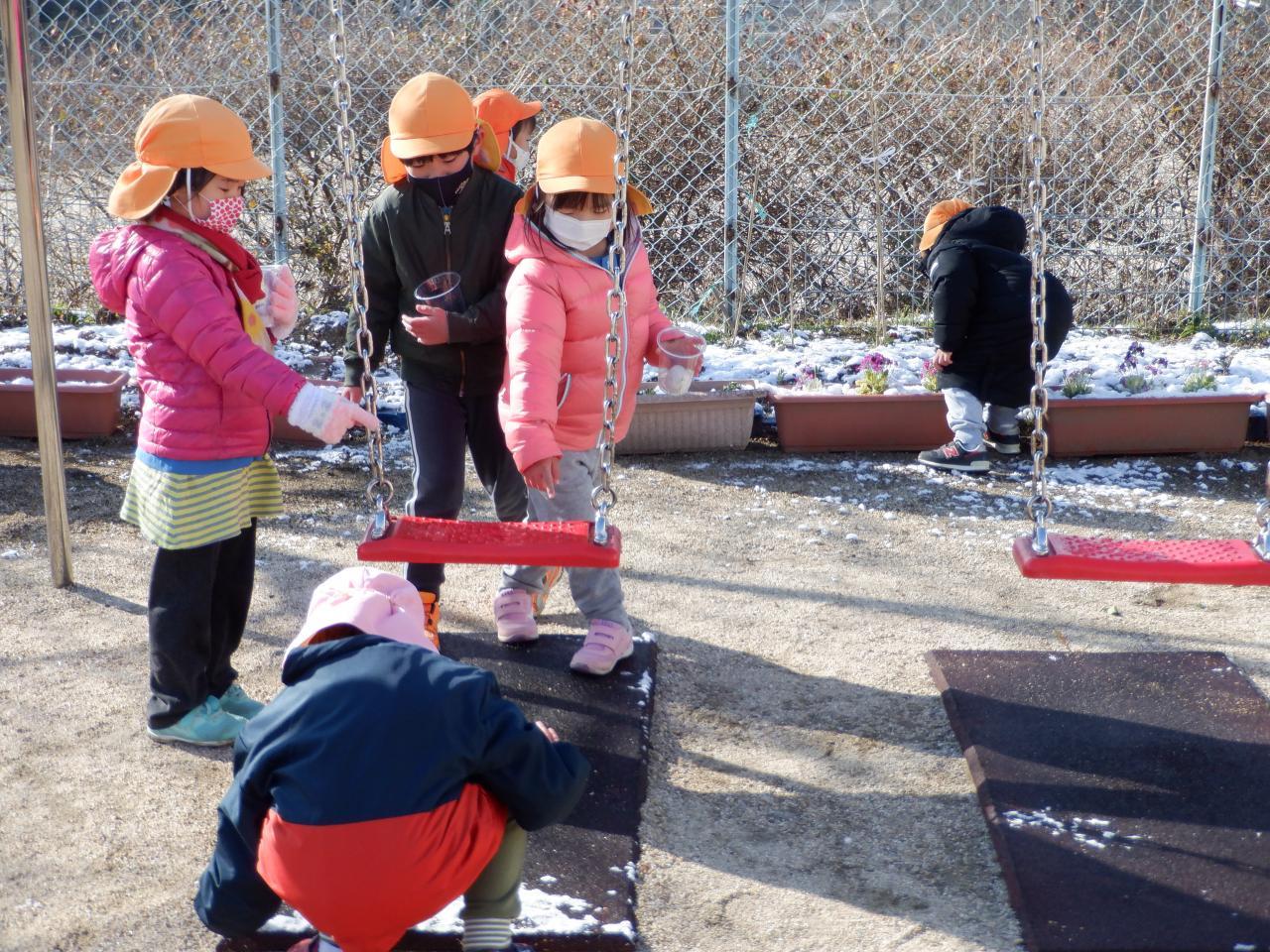 花壇の中、大型遊具、砂場のシートなど雪が積もっているところを見つけては歓声をあげていました。