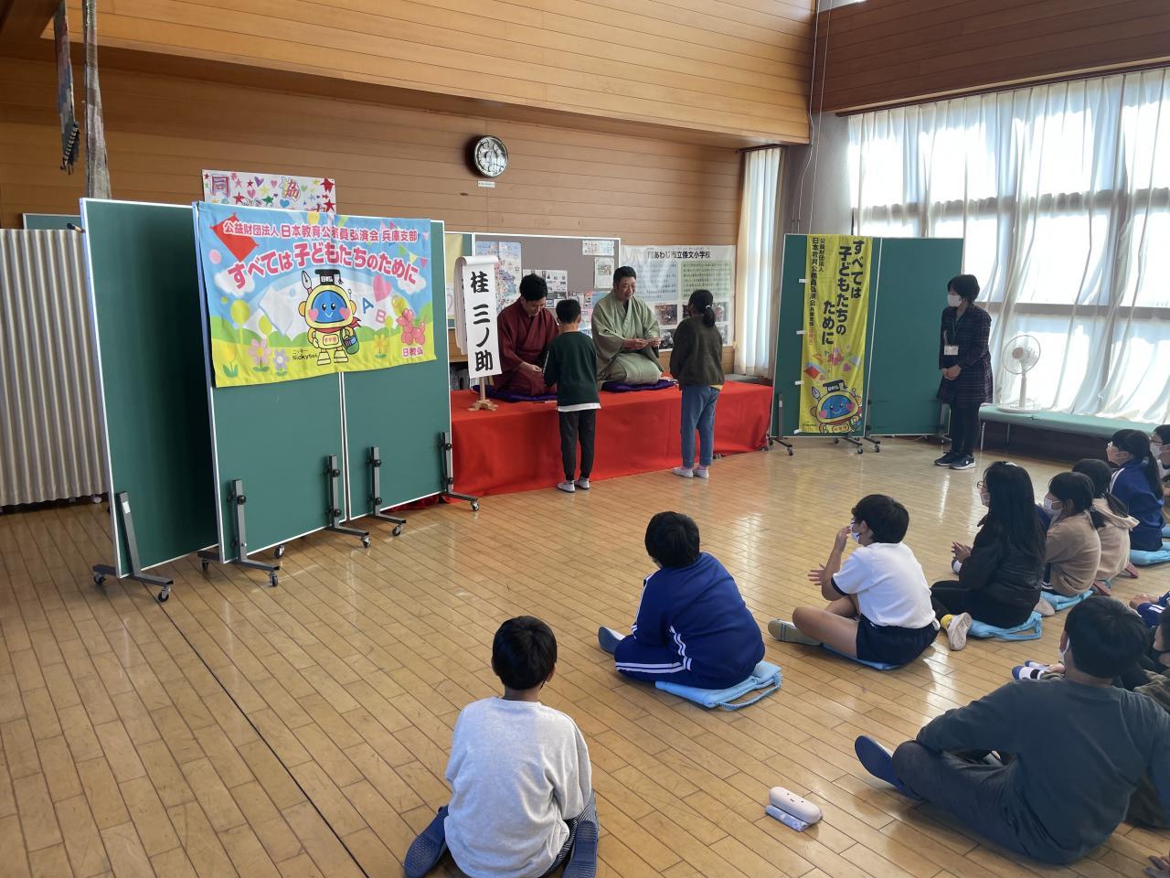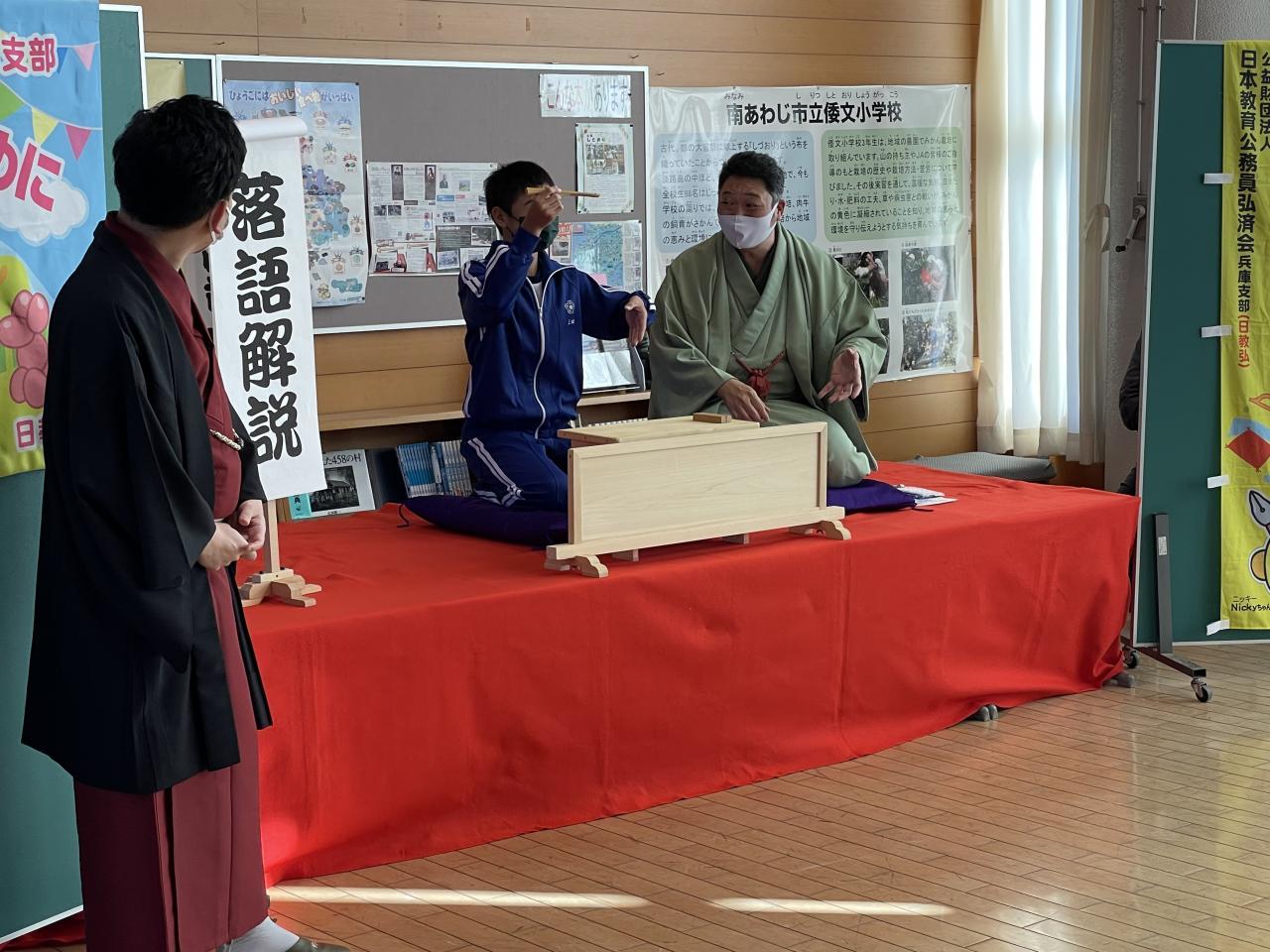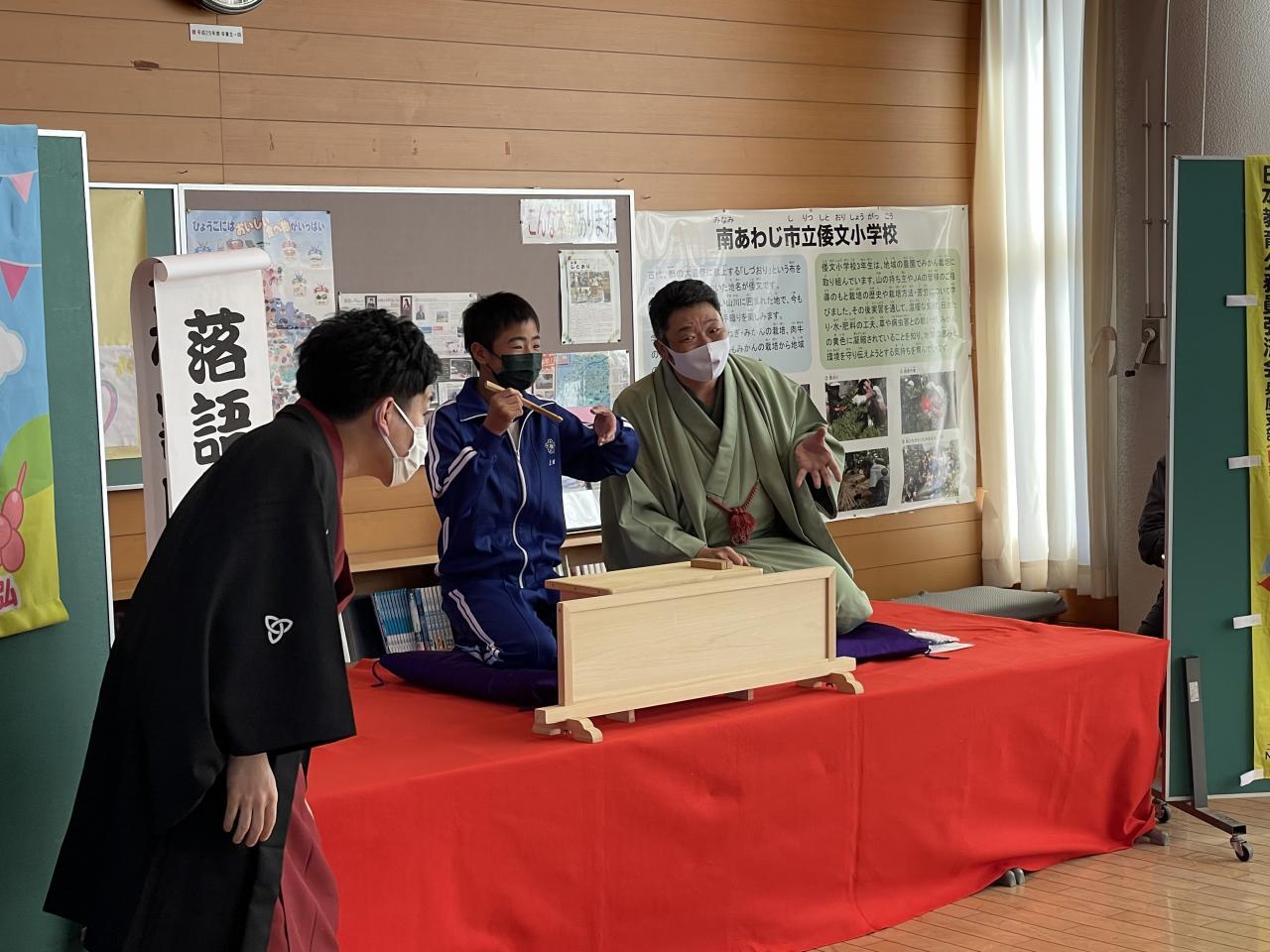 昨日桂三之助(かつらさんのすけ)さん、桂小留(かつらちろる)さんをお招きして、題して倭文寄席として落語鑑賞会を実施しました。落語は江戸時代から続く伝統芸能の一つとして現代でもテレビや寄席等で数多くの落語家が活躍されています。昨日は「落語」の歴史や落語の魅力について、話芸や扇子、手ぬぐいであらゆる物を想像させていく「おもしろさ、奥深さ」などを直接体験できました。またワークショップでは、児童を代表して6年生2名が高座に上がり落語に挑戦しました。とても落語のもつ話芸等楽しい時間を過ごすことが出来ました。