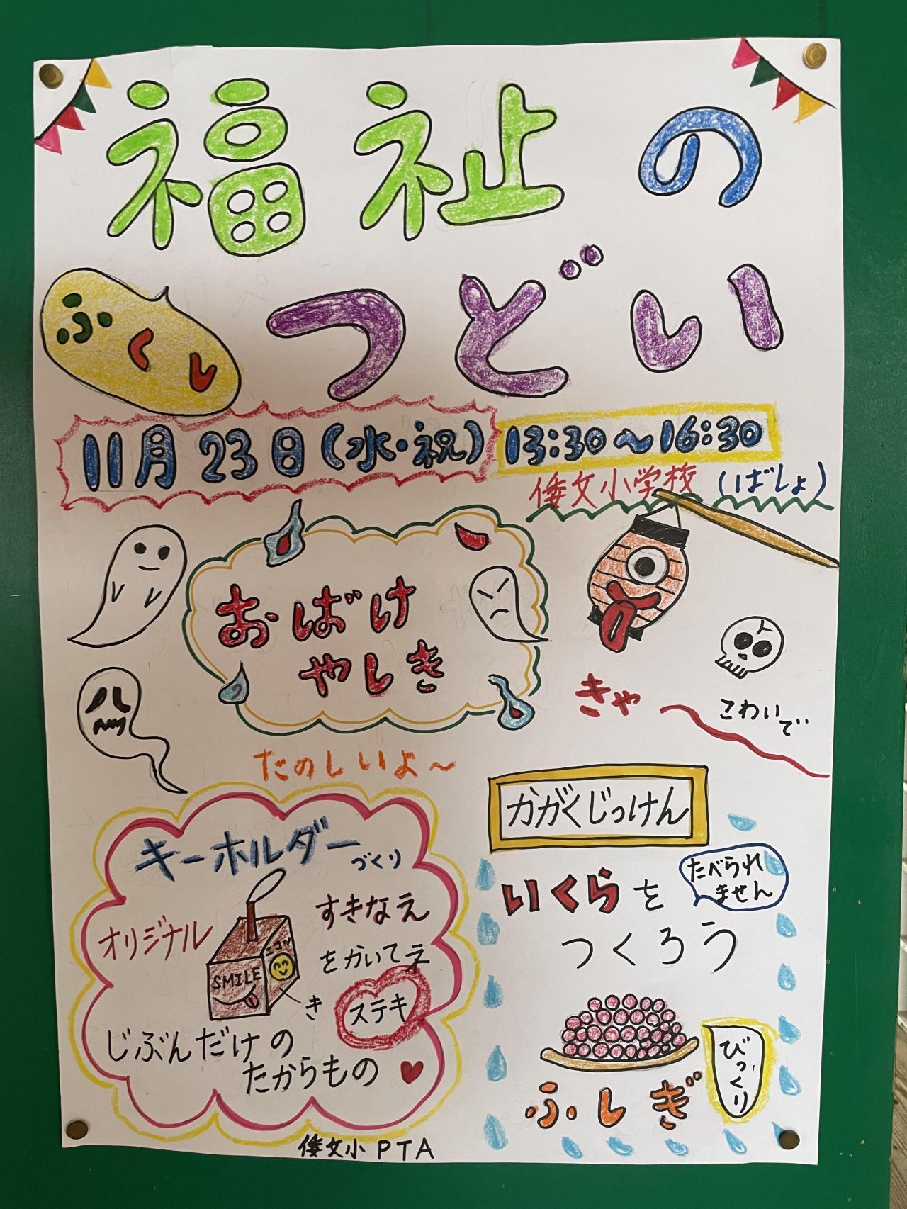連絡!明日本校を会場に南あわじ市社会福祉協議会主催「第3回みどり福祉のつどい」が開催されます※13:30~(舞台発表)、14:30頃~(体験・販売ブース)。本校より「しづおり販売」(児童有志が販売員を勤めます)そしてPTAが「おもしろ工作ブース、チャレンジ人工イクラ作り、お化け屋敷」を