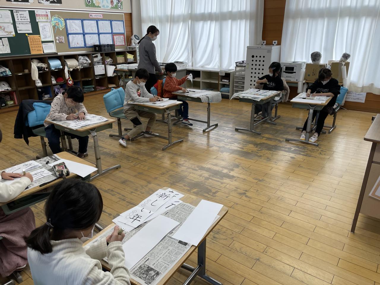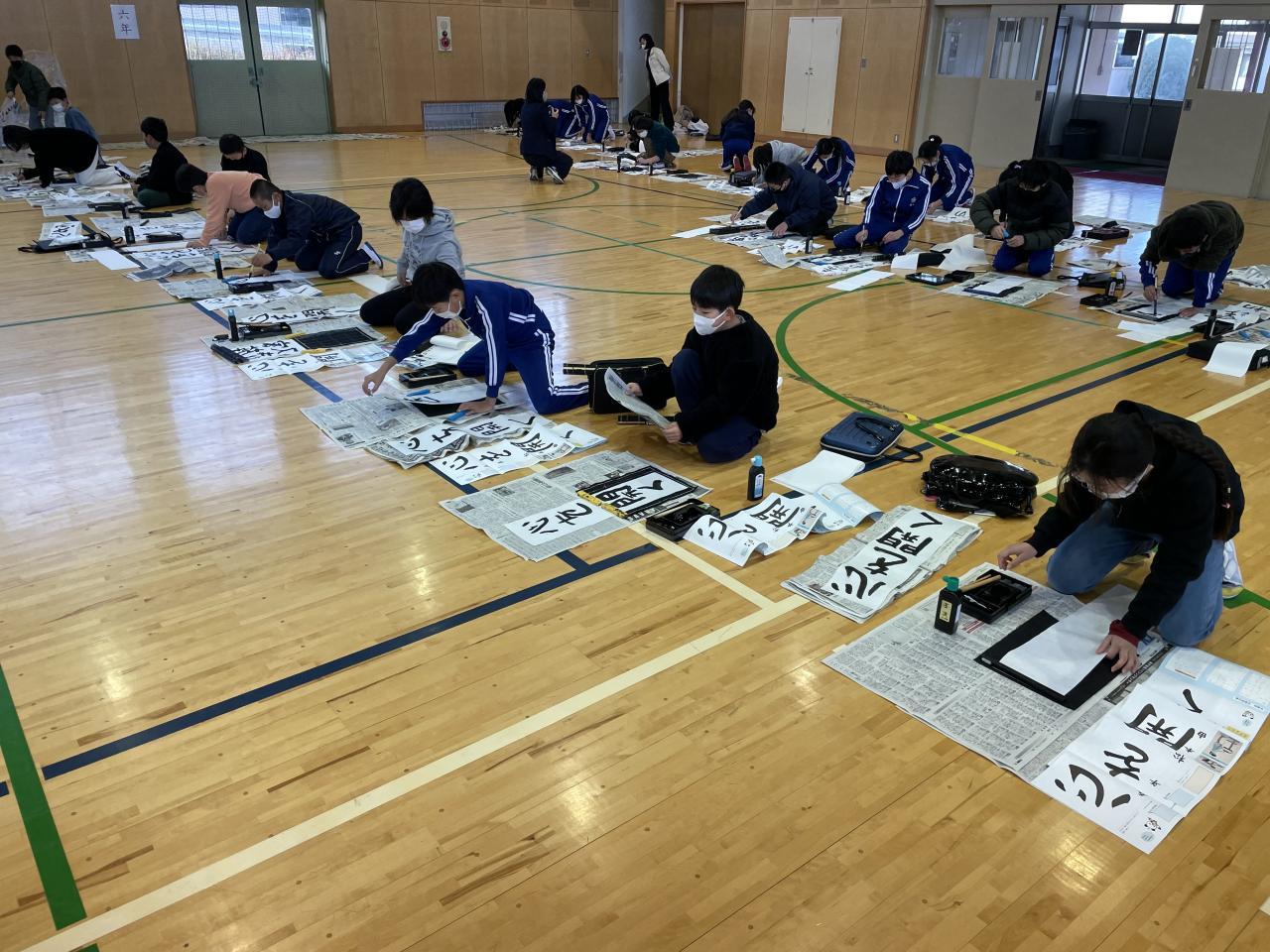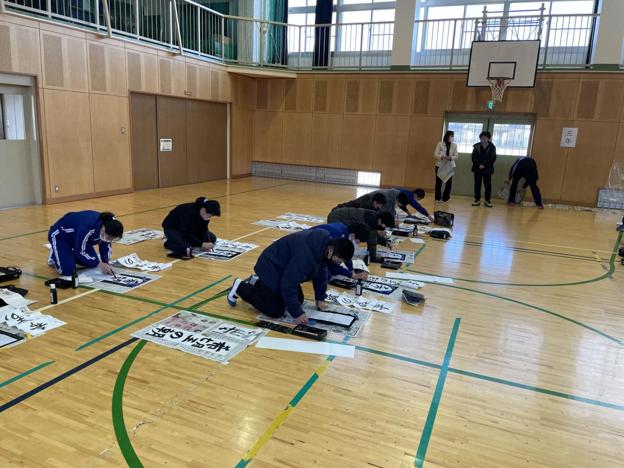 本日3学期始業式を行い新学期がスタートしました。(始業式の内容については明日発行する「学校だより第14号」(あんしんネット配布物にも明日添付します)を参考にしてください。始業式後全校生(1.2年生は教室)で「書初め」を行いました。手本を見ながら落ち着いて全員書初めに集中しました。