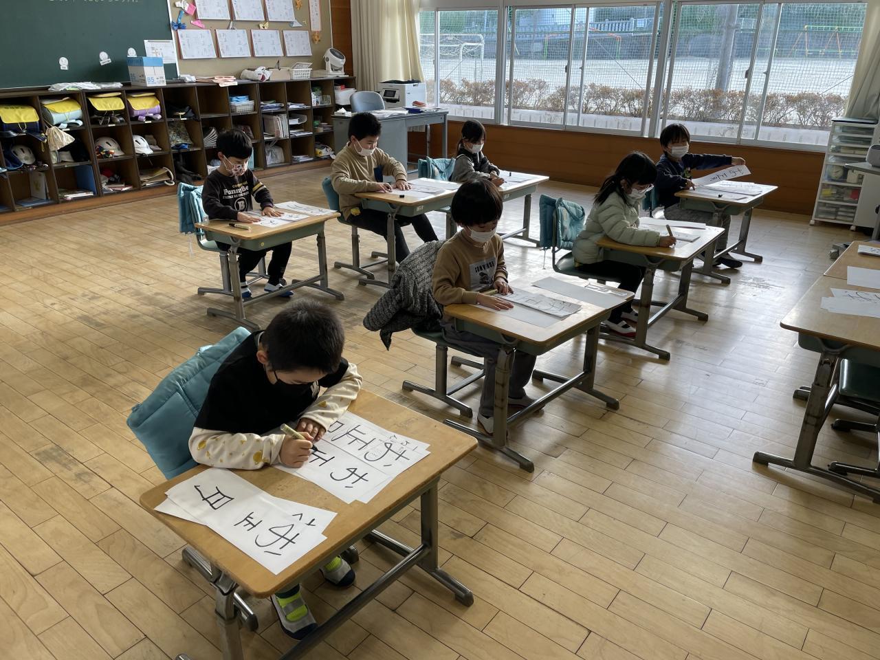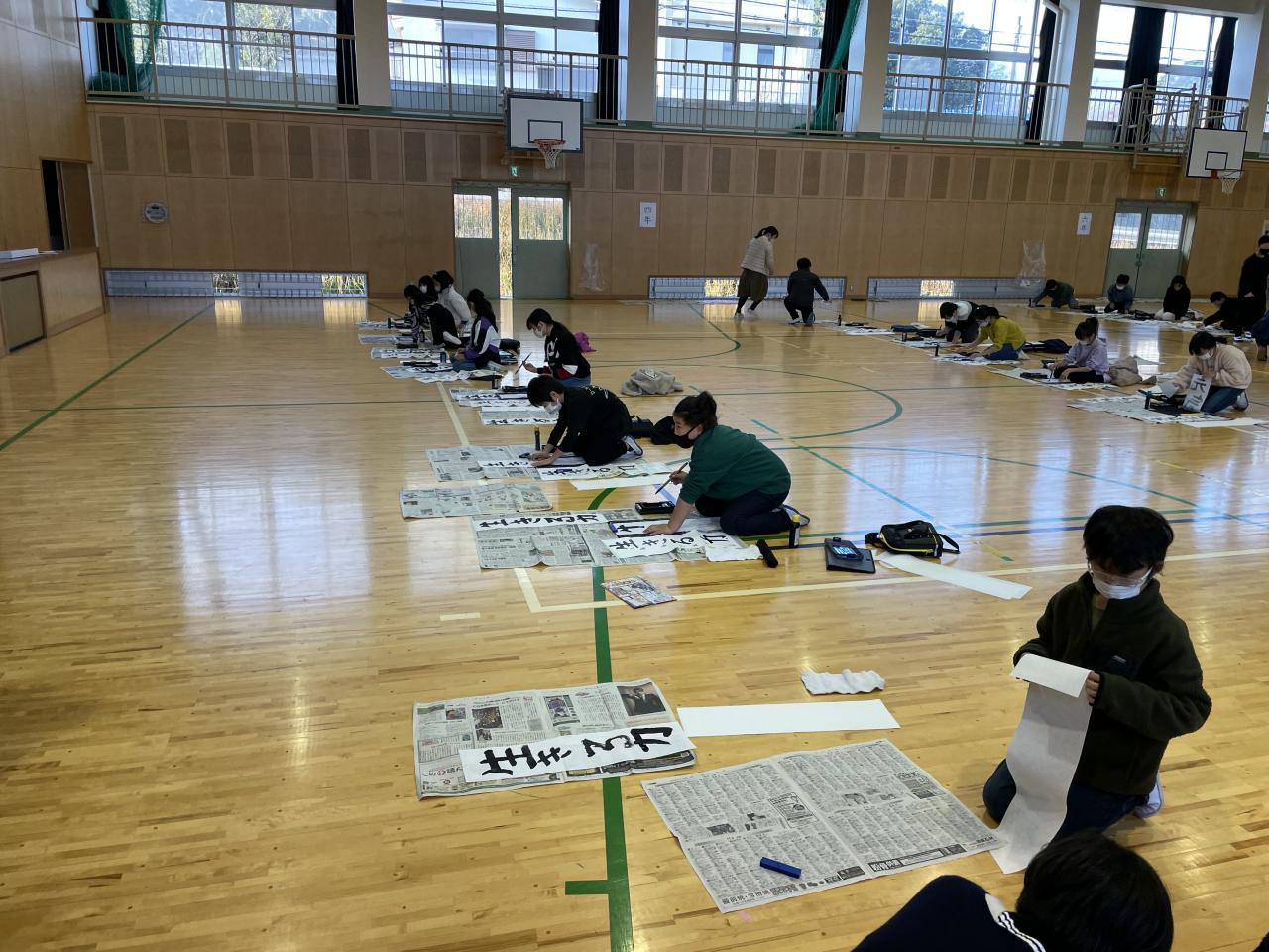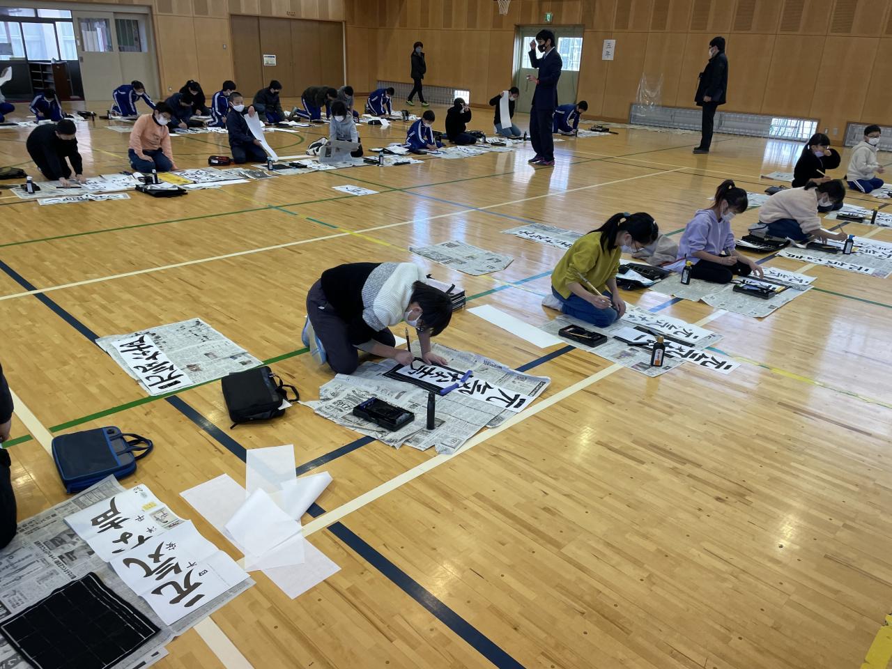 本日3学期始業式を行い新学期がスタートしました。(始業式の内容については明日発行する「学校だより第14号」(あんしんネット配布物にも明日添付します)を参考にしてください。始業式後全校生(1.2年生は教室)で「書初め」を行いました。手本を見ながら落ち着いて全員書初めに集中しました。