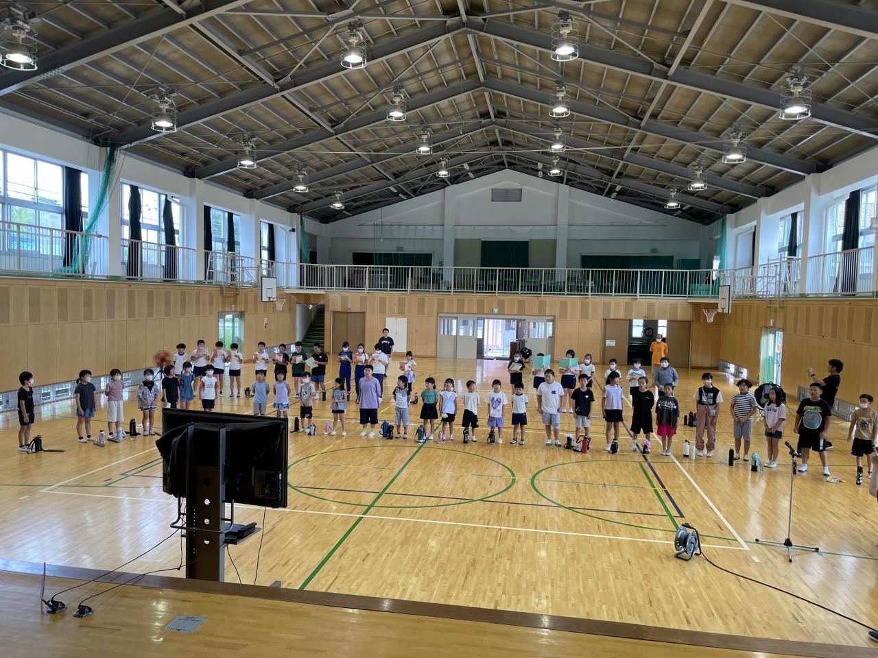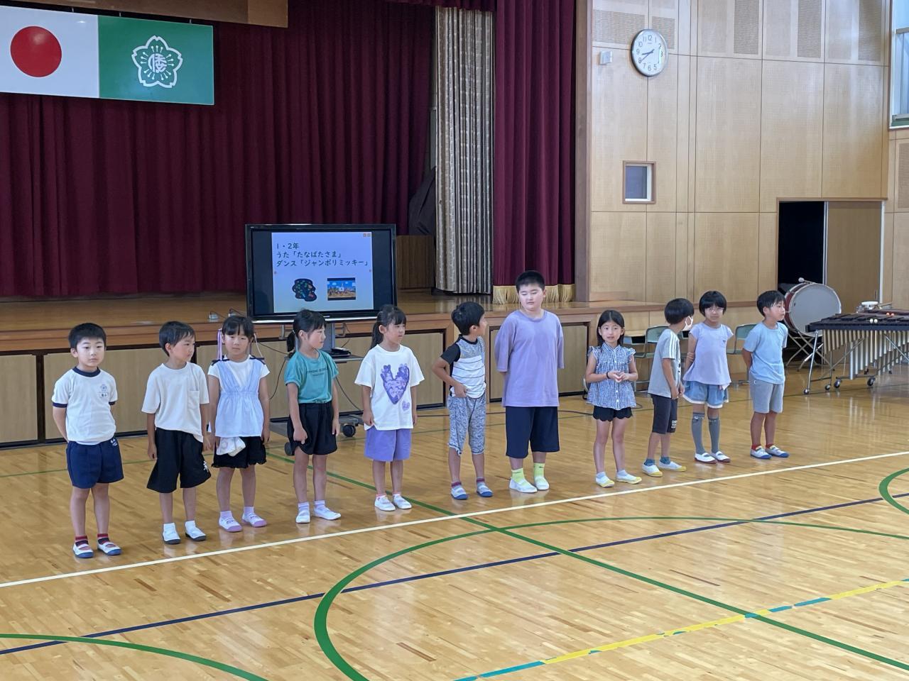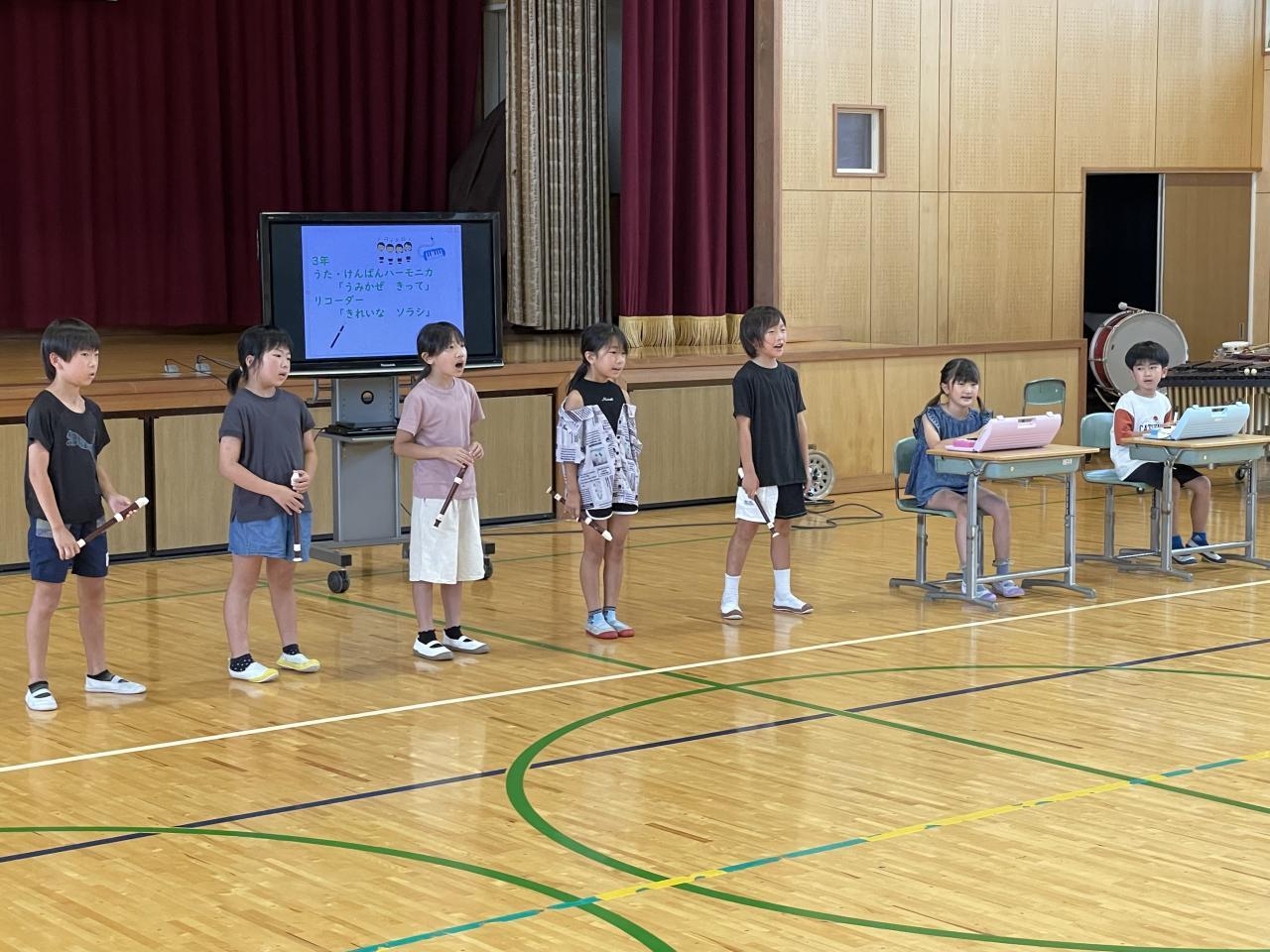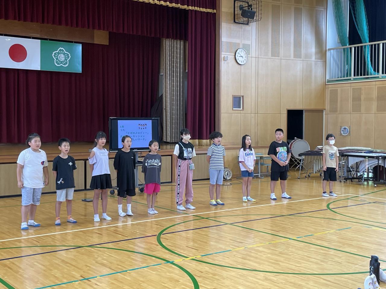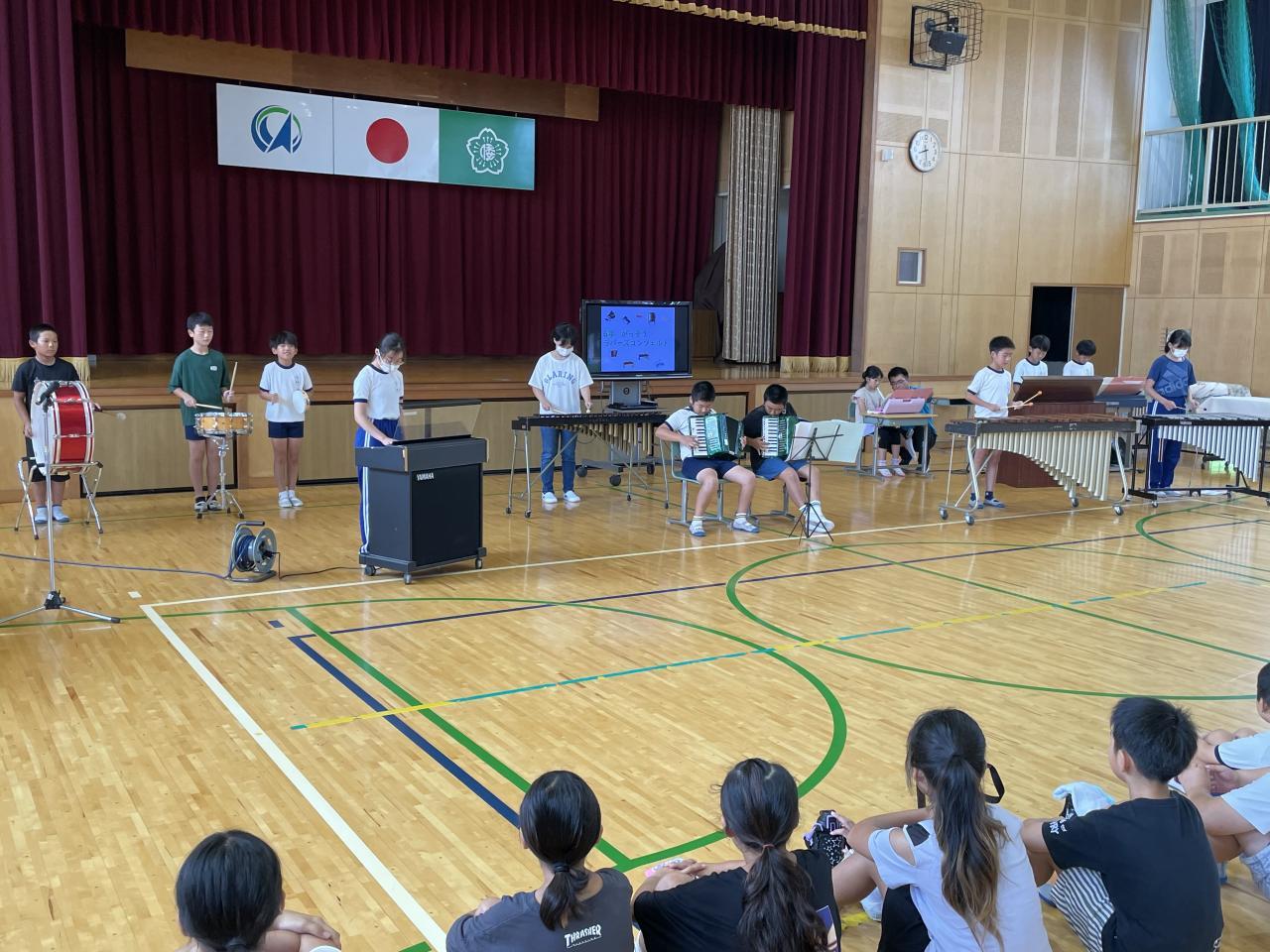 本日全校生で「音楽集会」を行いました。各学年から合奏や合唱、ダンスの発表、そして全校生で「こどものせかい」「どらやきバウンド」「エーデルワイス」を合唱しました。とても暑かったですが心地よい楽器の音色や綺麗な歌声、爽快なダンスで暑さを忘れて音楽を楽しむことが出来ましした。