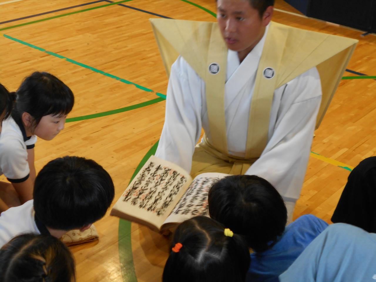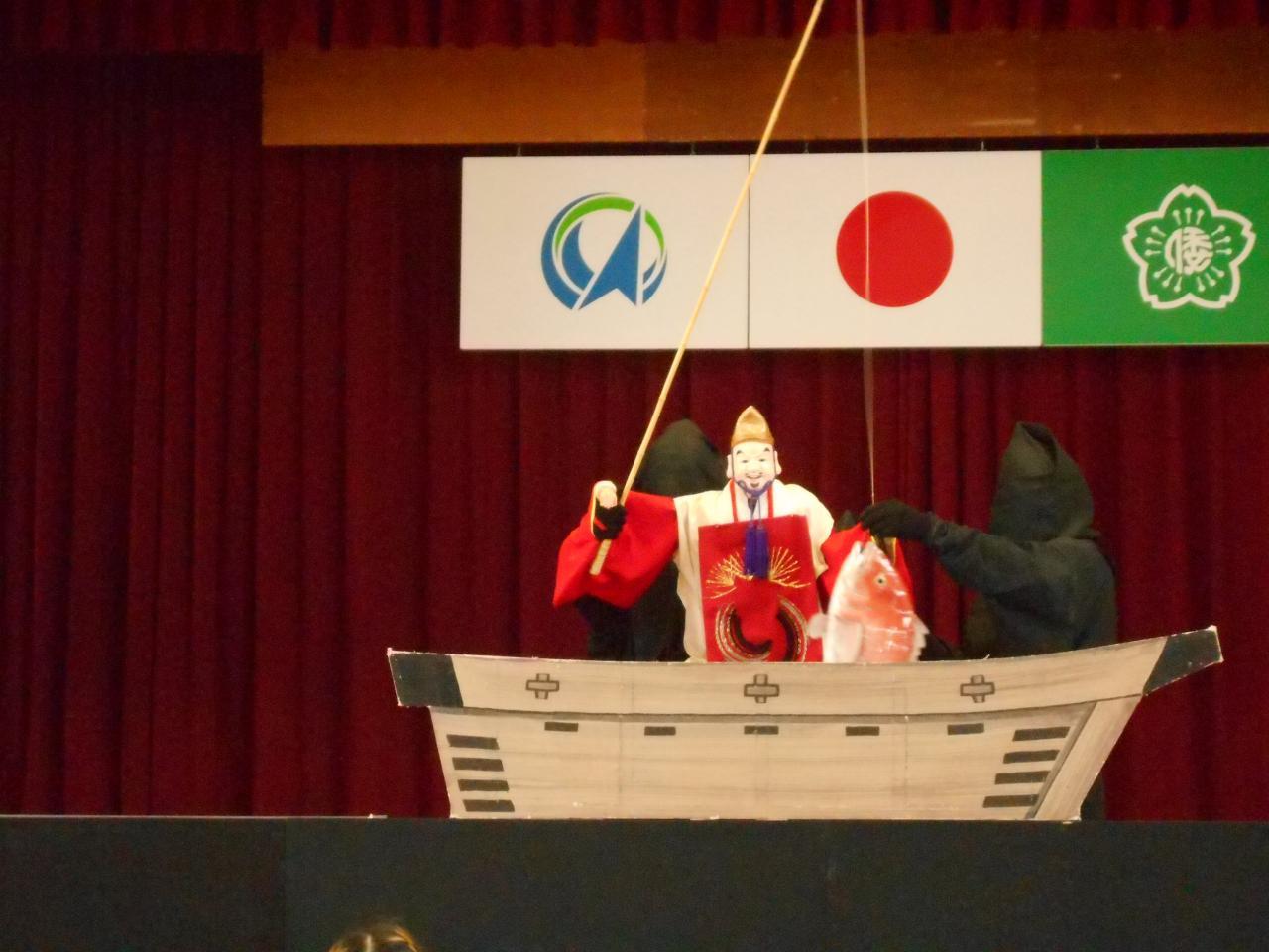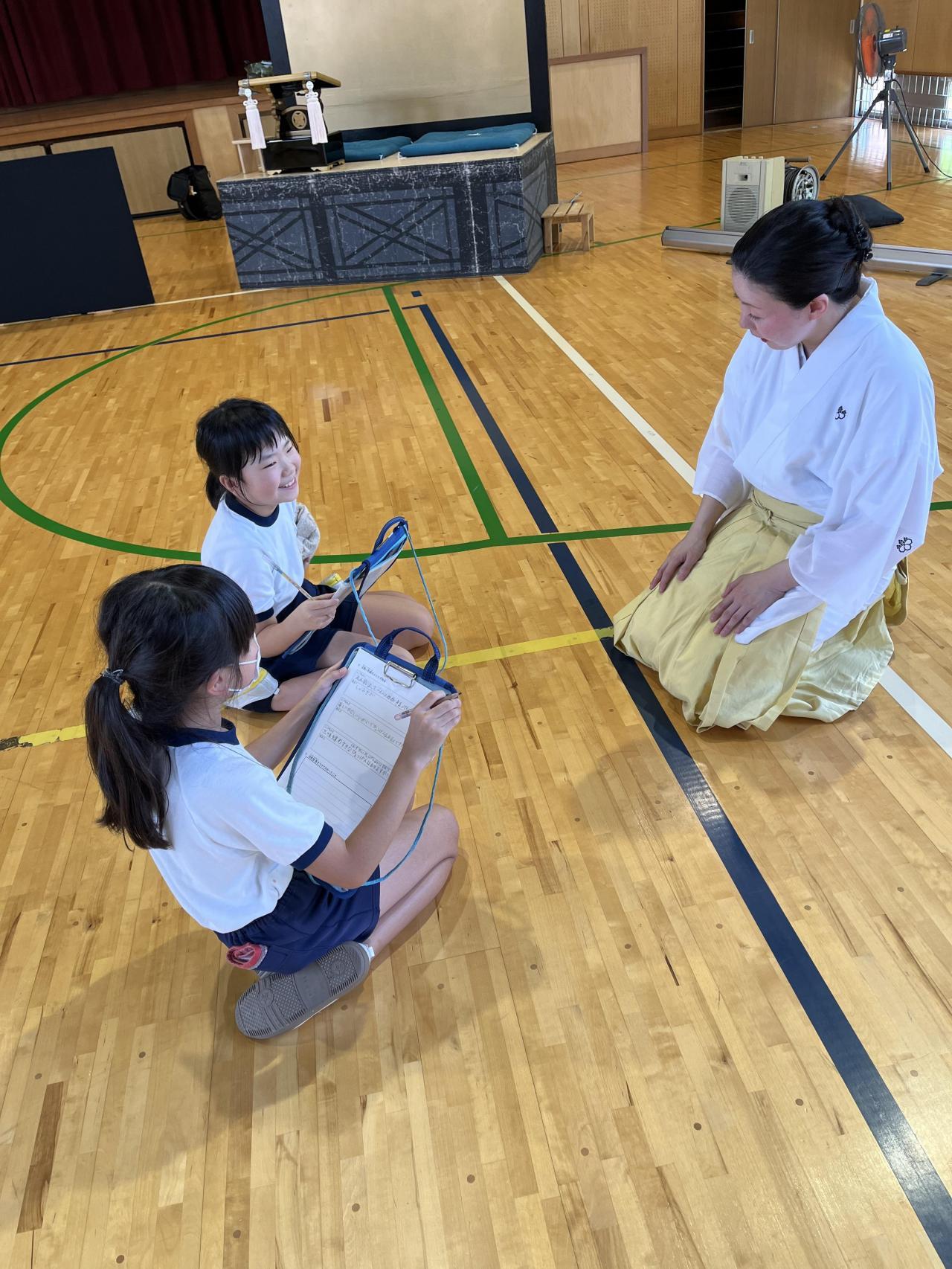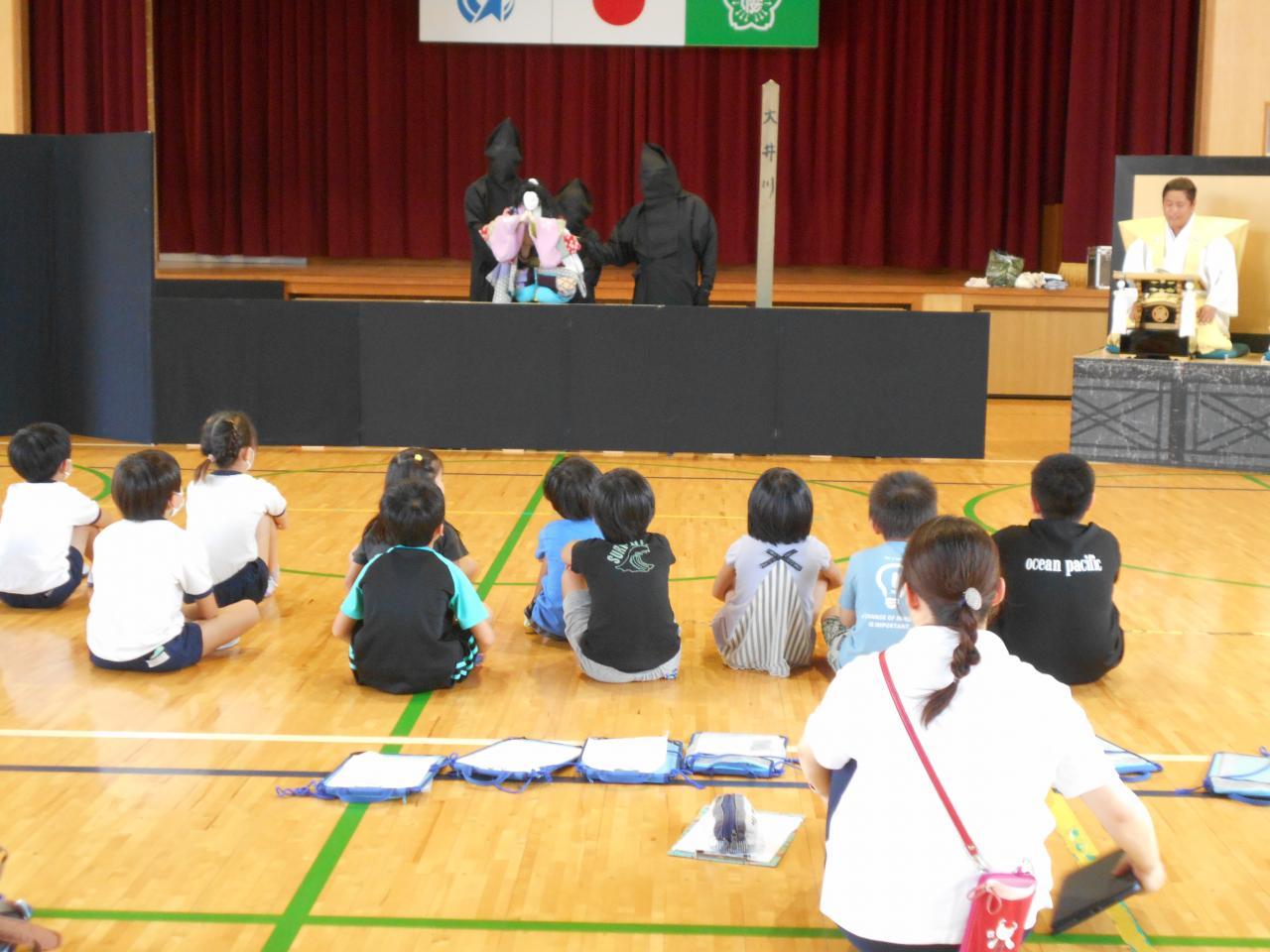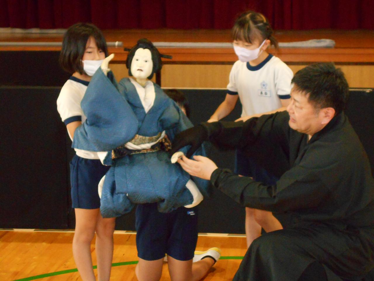3・4時間目に淡路人形座の出前授業があり、2・3年生が参加しました。はじめに「生写朝顔話(いきうつしあさがおにっき)大井川の段」という演目の一部を見せてもらいました。その後、人形浄瑠璃について「太夫」「三味線」「人形遣い」ごとに説明がありました。「太夫」は一人で何役も演じ分けるため、声の出し方を工夫していることや、姿勢や声を安定させるために使っている道具などがあると教えてもらいました。「三味線」は義太夫三味線といい、太く重たい音が出る三味線を使っているそうです。「人形遣い」は一つの人形を3人で扱い、それぞれの役目が決まっていることや、人のように見える動かし方のコツを教えてもらいました。その後人形遣いの体験を行い、最後に「戎舞」を見せてもらいました。南あわじ市の伝統文化に触れ、いろんな発見があった出前授業でした。