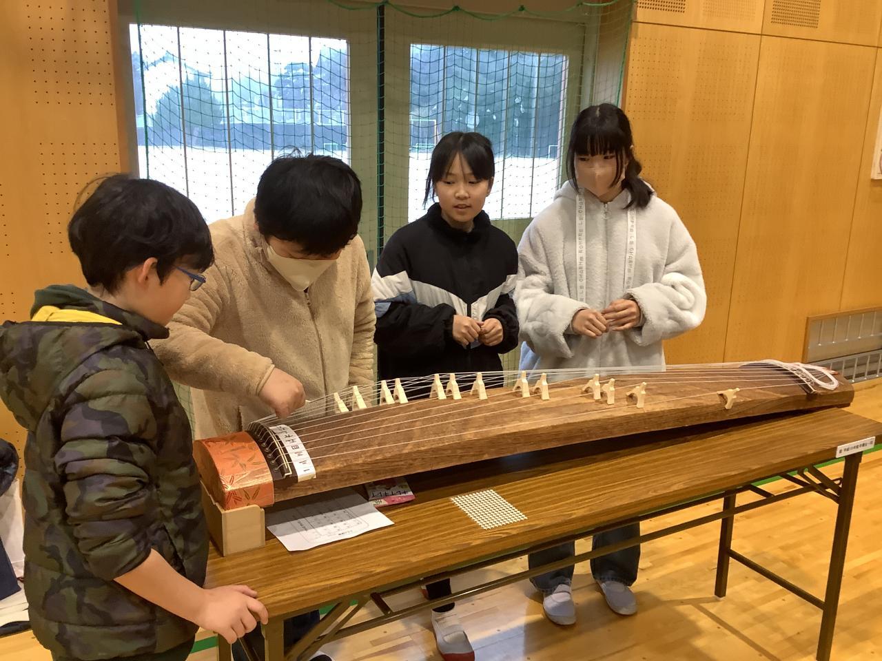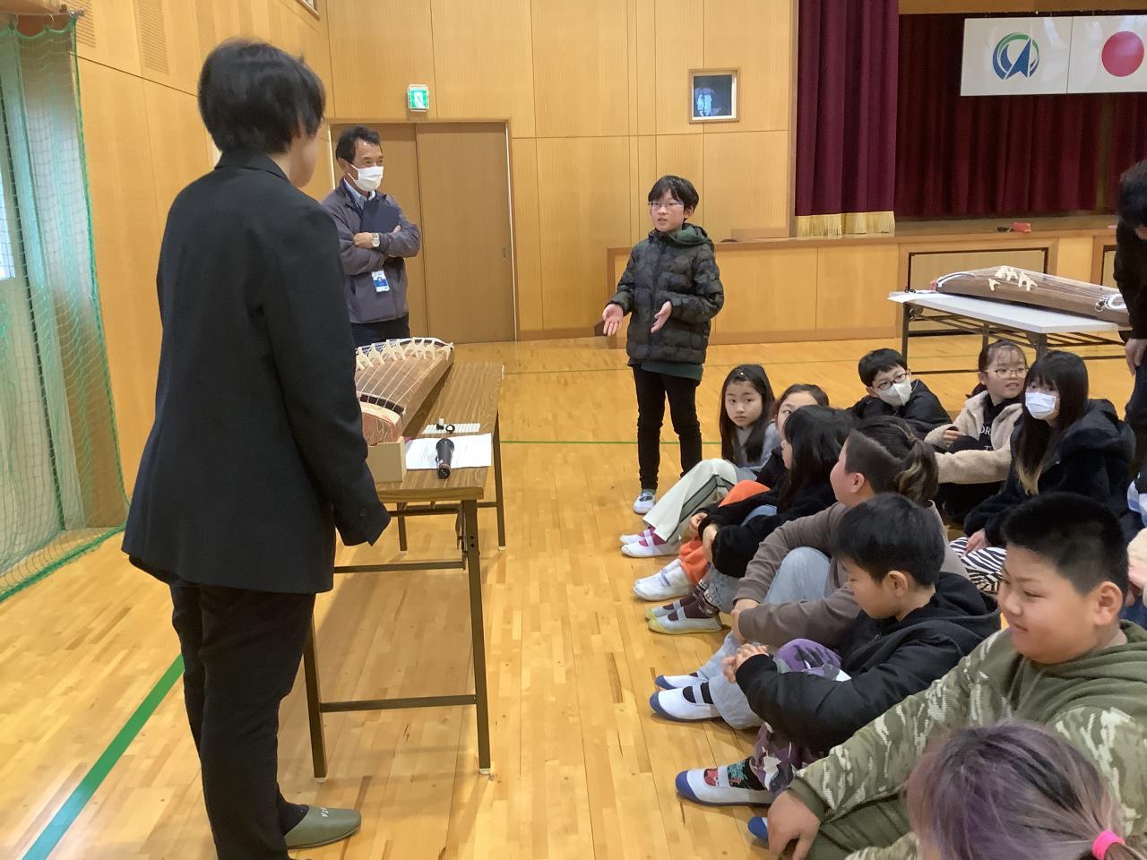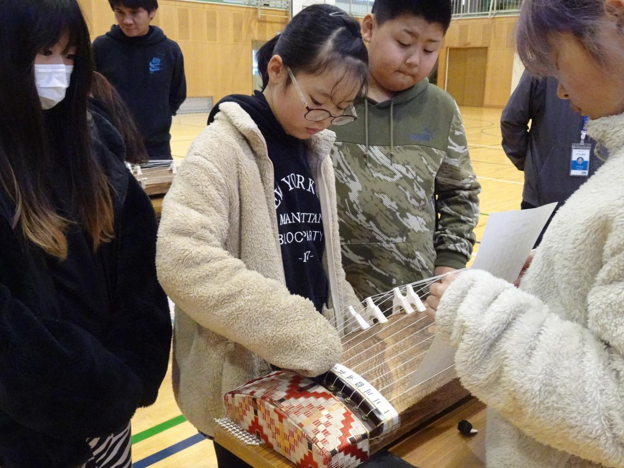 2月21日(水)4・5年生が音楽の授業の一環で、琴奏者の大歳久美子さんを講師にお招きし、琴を弾く体験をしました。はじめに「琴」についてのお話を聞き、その後グループに分かれて交代で「さくら さくら」の演奏に挑戦しました。最初はおそるおそる音を出していましたが、大歳さんから琴爪の当て方や力の入れ方などを教えていただき、次第に力強い音が出るようになっていきました。演奏していないときも、弾く絃の場所を教えたり、楽譜を見ながら絃の番号を読み上げたりして、グループが一つになって演奏することができました。琴ののびやかな響きが体育館中に広がり、和楽器の良さを楽しめた1時間となりました。