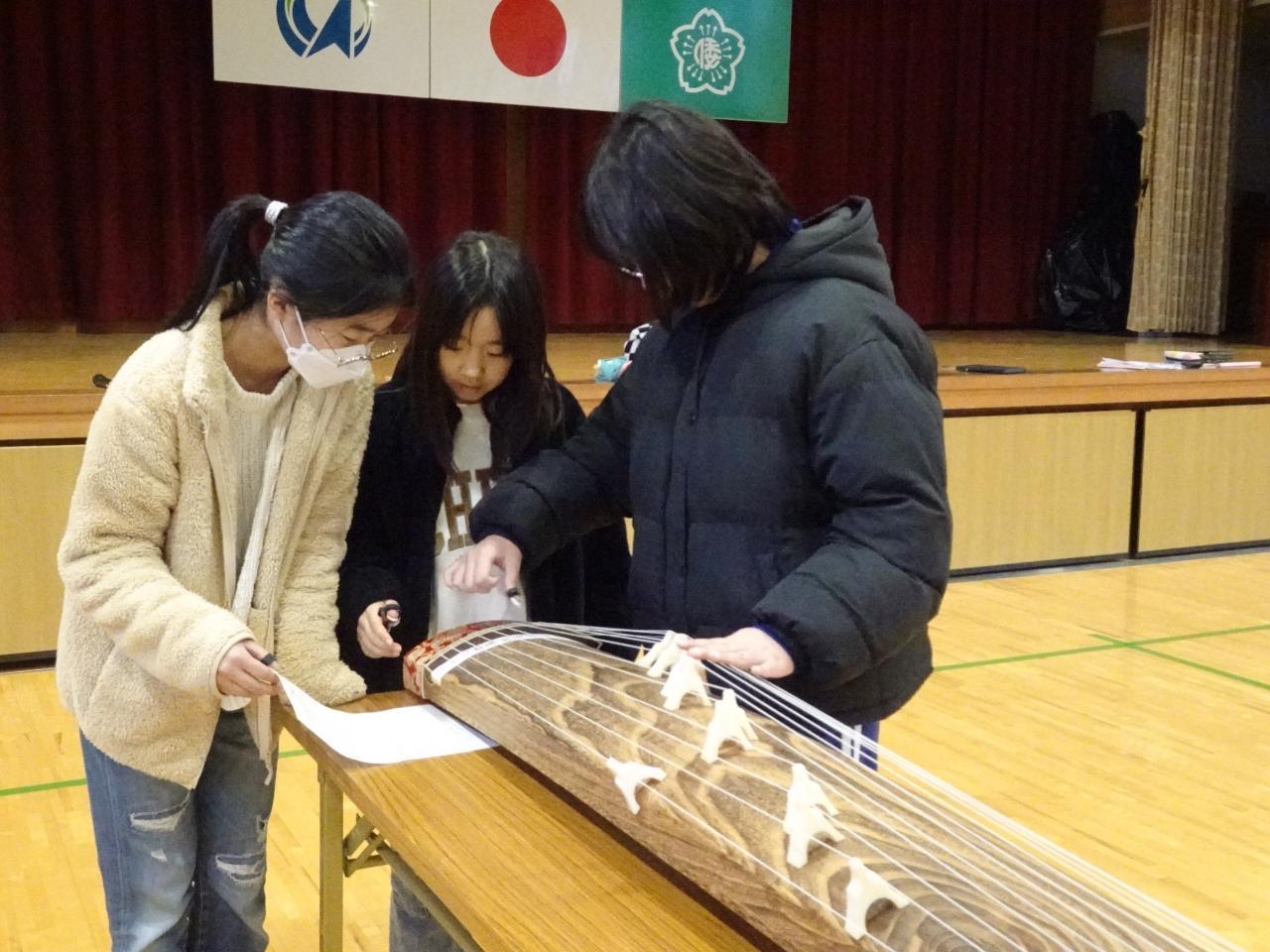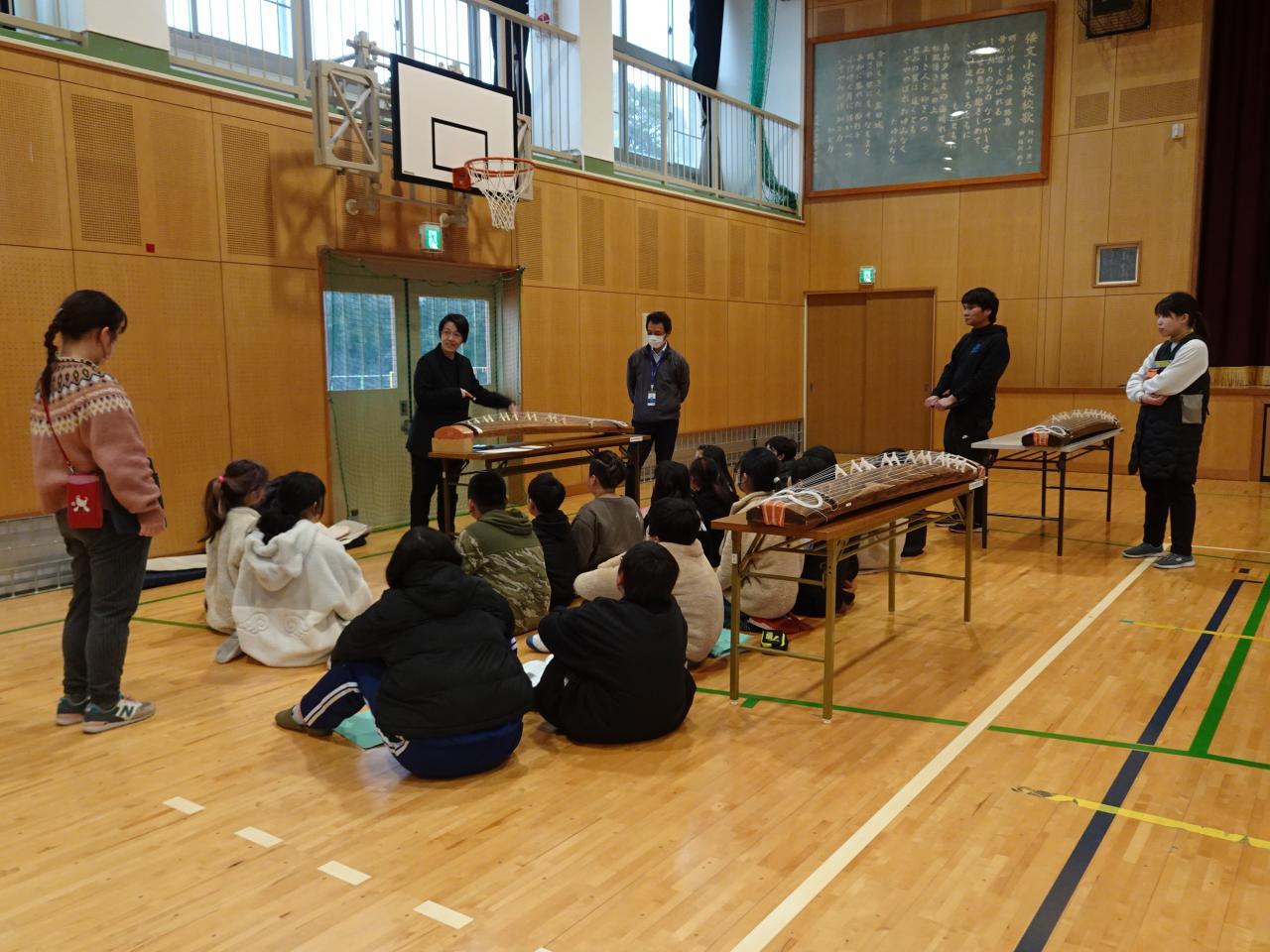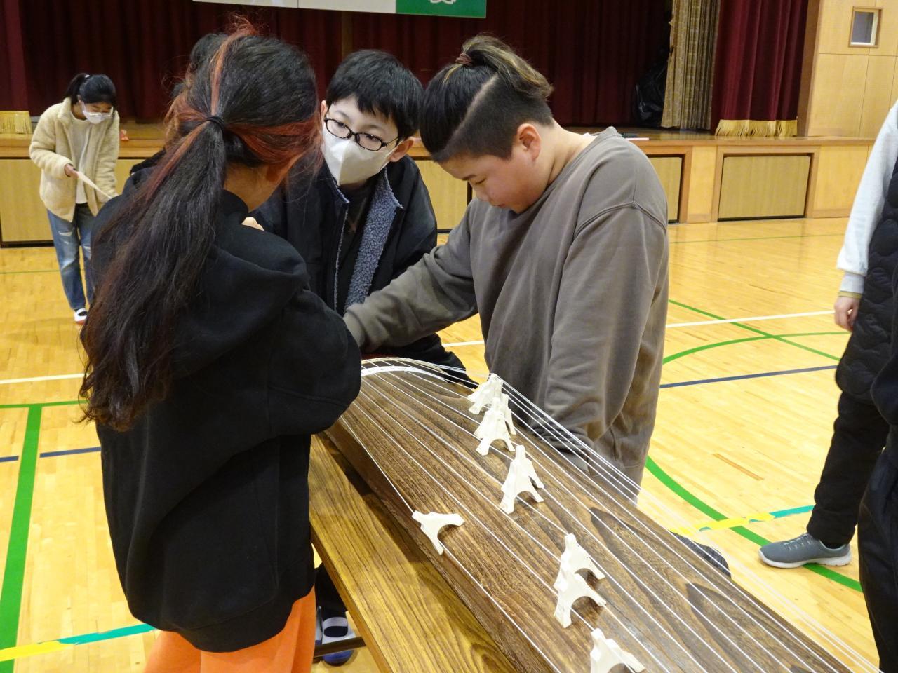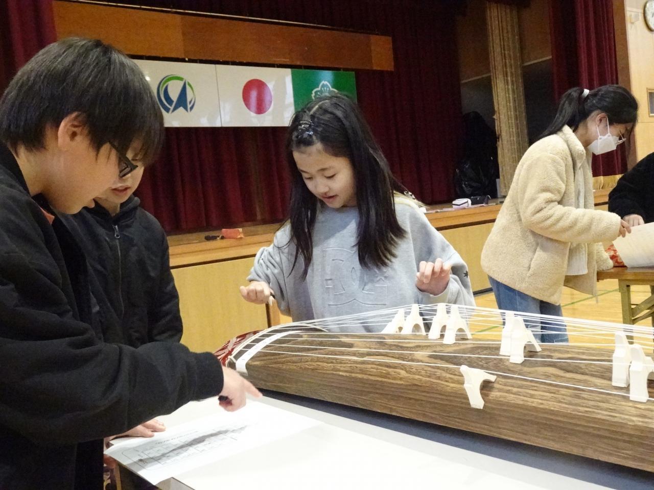 2月21日(水)4・5年生が音楽の授業の一環で、琴奏者の大歳久美子さんを講師にお招きし、琴を弾く体験をしました。はじめに「琴」についてのお話を聞き、その後グループに分かれて交代で「さくら さくら」の演奏に挑戦しました。最初はおそるおそる音を出していましたが、大歳さんから琴爪の当て方や力の入れ方などを教えていただき、次第に力強い音が出るようになっていきました。演奏していないときも、弾く絃の場所を教えたり、楽譜を見ながら絃の番号を読み上げたりして、グループが一つになって演奏することができました。琴ののびやかな響きが体育館中に広がり、和楽器の良さを楽しめた1時間となりました。