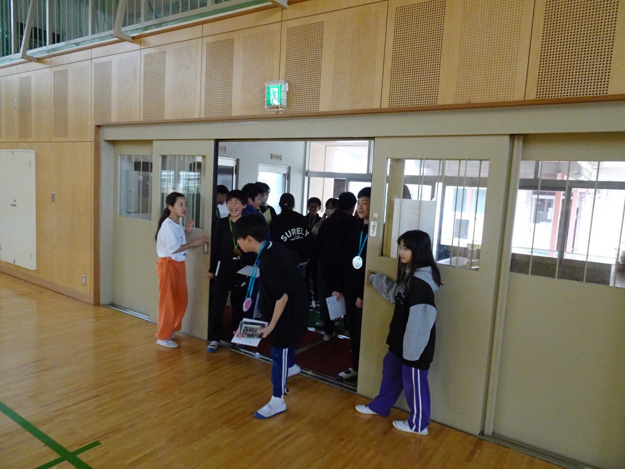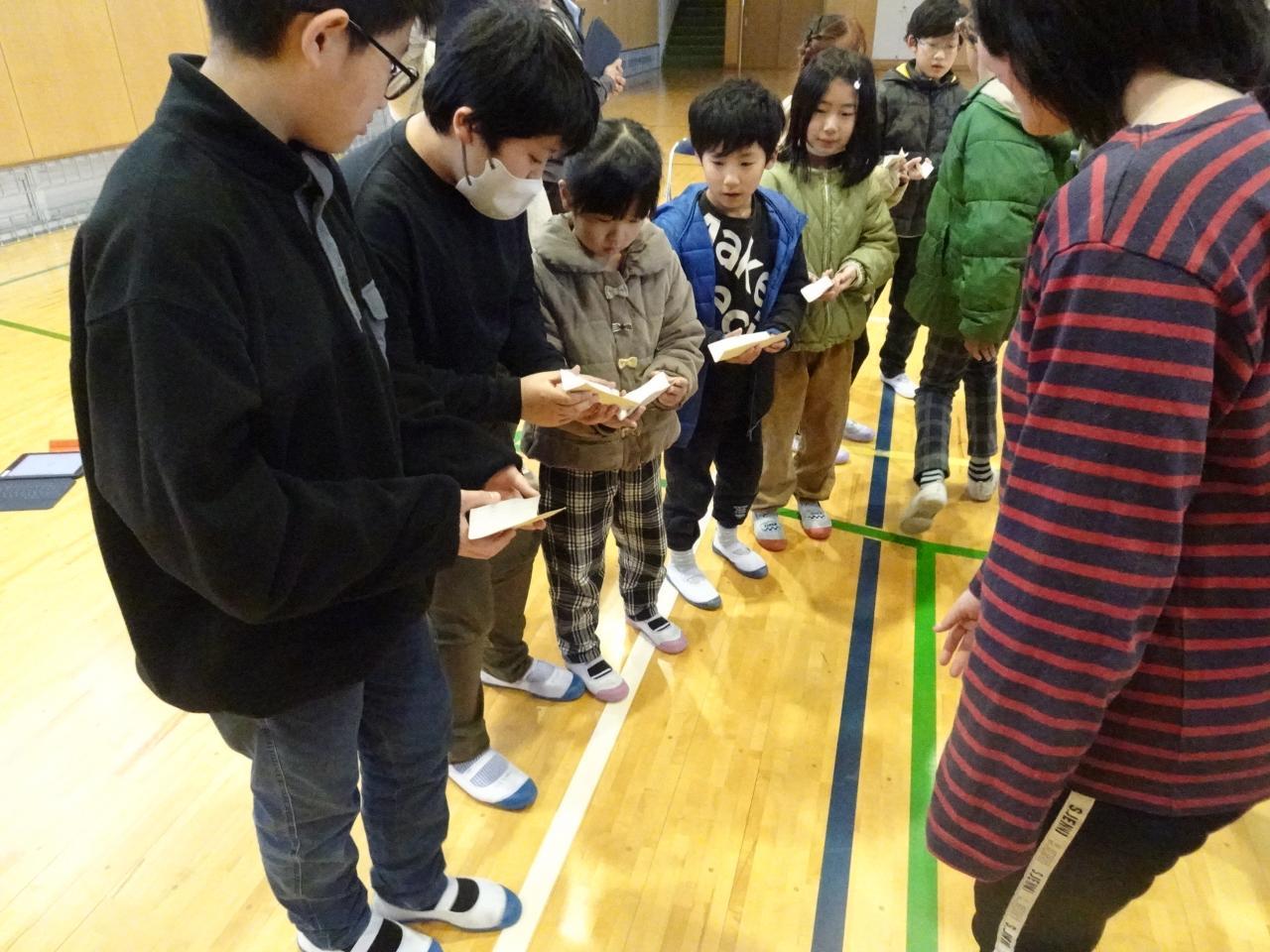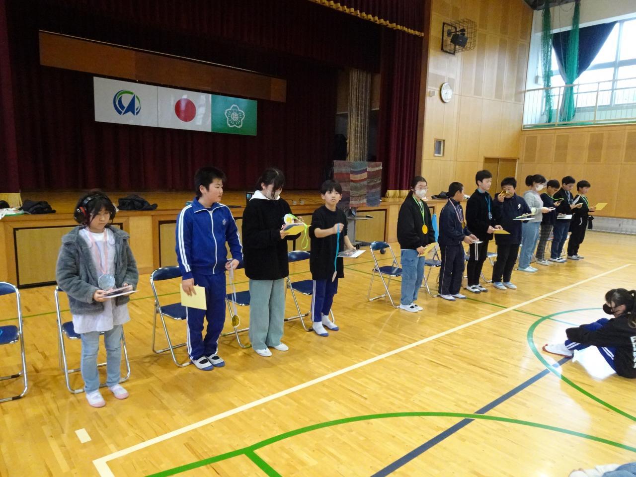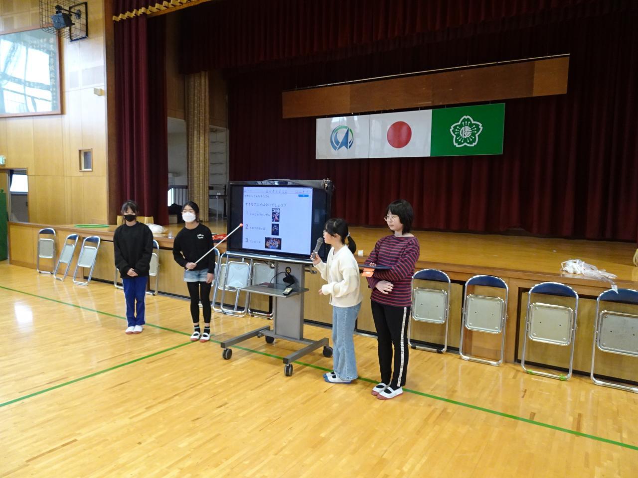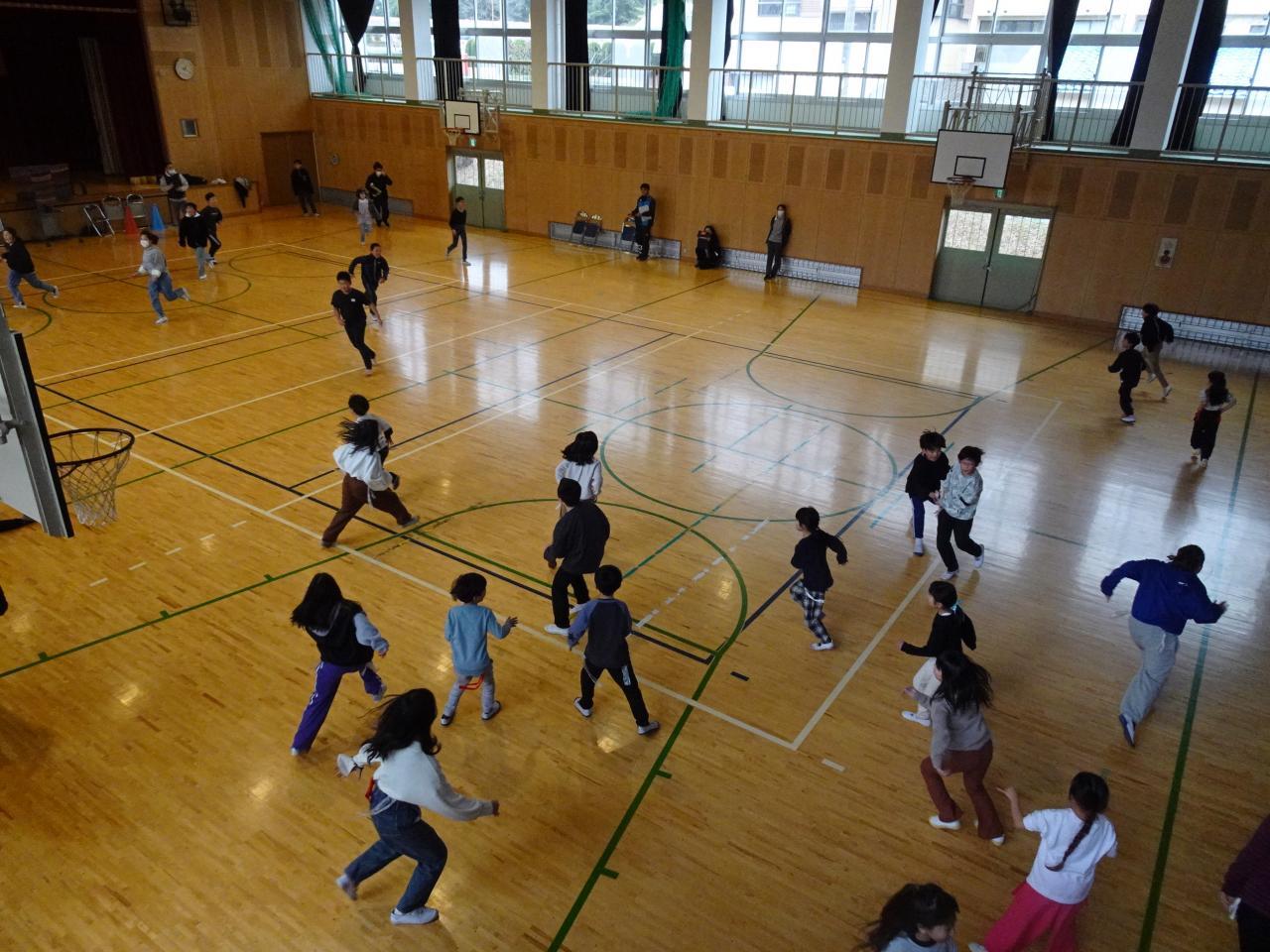 本日6年生を送る会を5年生と新児童会役員が中心になって実施しました。最初に全校生が3つの学年の枠をこえた縦割りグループに分かれて「どんぐり転がしゲーム」からスタートしました。各グループで知恵を出し合いながら楽しく「どんぐり」を転がしていました。次は「6年生クイズ」ということで、事前に6年生に調査して5年生が作成した楽しいクイズに挑戦しました。好きな食べ物やスポーツ選手、ブランド名、アニメなど6年生一人ひととりの個性を垣間見ることができる内容の楽しいクイズでした。次は体育館一杯を使った「しっぽとりゲーム」を行い、6年生が下級生の「しっぽ」を奪い取ろうと必死に追いかけ、下級生は「しっぽ」を取られまいとこれまた必死に逃げ回っていました。制限時間3分を2回全校生で楽しみました。そして「学校クイズ」で学校のことをよりよく知るクイズを〇✖で答える内容でした。最後に下級生からこれまでお世話になった6年生へ「心込めた作成したプレゼント」を一人ひとりに贈りました。6年生はとてもいい笑顔でプレゼントを受け取っていました。体育館出口から6年生が大きな声で下級生へお礼を返していました。とてもいい「6年生を送る会」になりました。