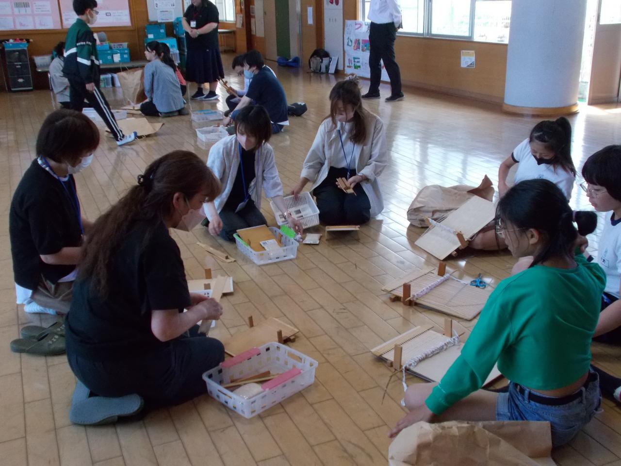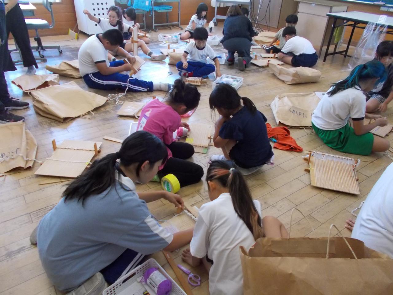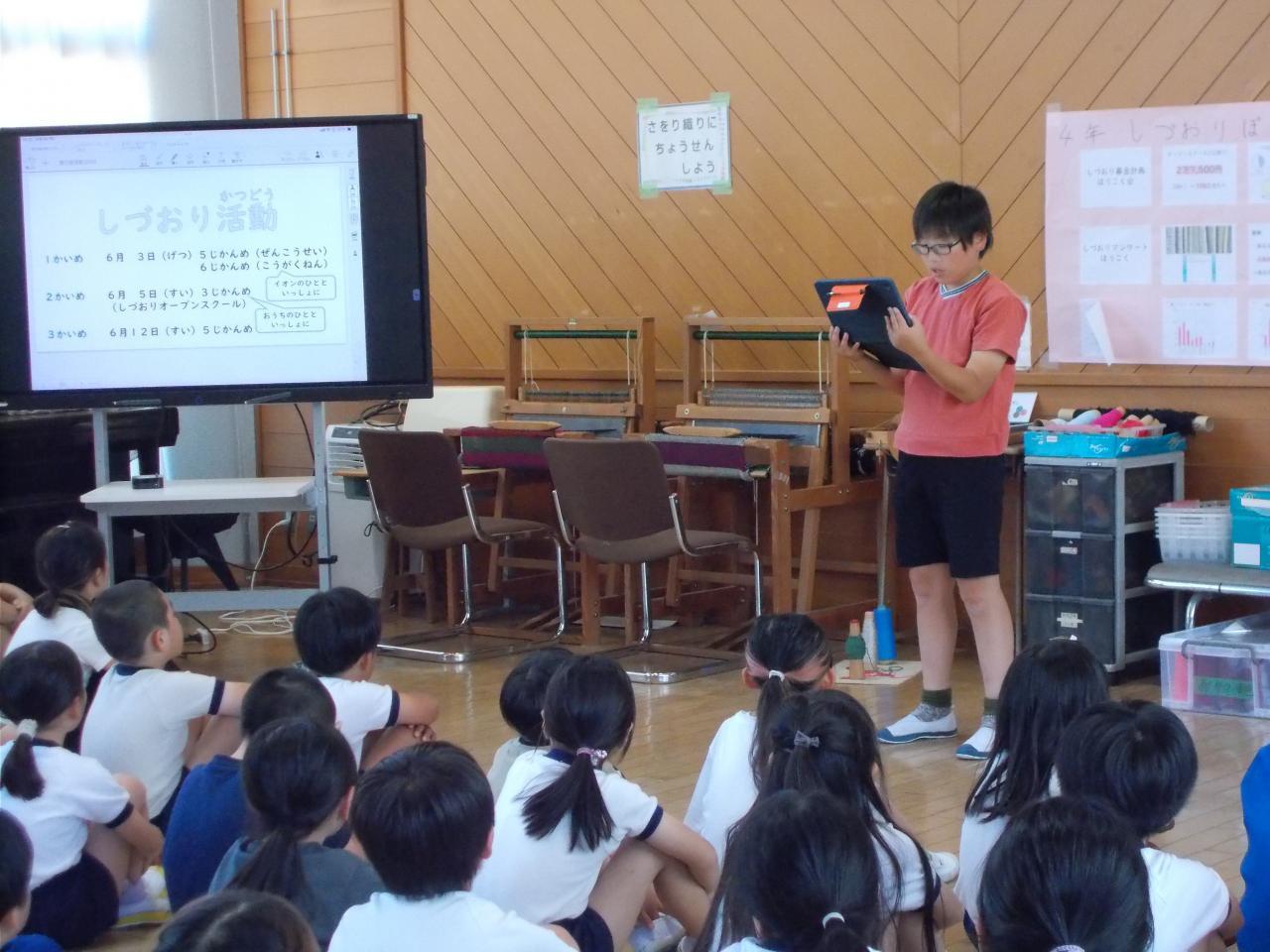 6月3日(月)今年度に入って初めてのしづおり活動を行いました。今回はイオンの皆さんも一緒に活動を行いました。1年生は初めてのしづおり。2~6年生は取り組む内容が変わった学年もあり、目標を新たに取り組みました。これから1年間、しづおりを織ったり、製品を作ったりしながら、いろんな人と関わり、しづおりを通して倭文の良さを発見・発信していく活動になればと思っています。明日のオープンスクールも、子どもたちと一緒にしづおりを楽しむ時間となっています。今年は、兄弟が同じ場所で活動するようにしていますので、ご家族でお楽しみください。オープンスクールは 10:25~ しづおり活動 11:20~ 親子情報モラル教室です。ご来校 お待ちしています。