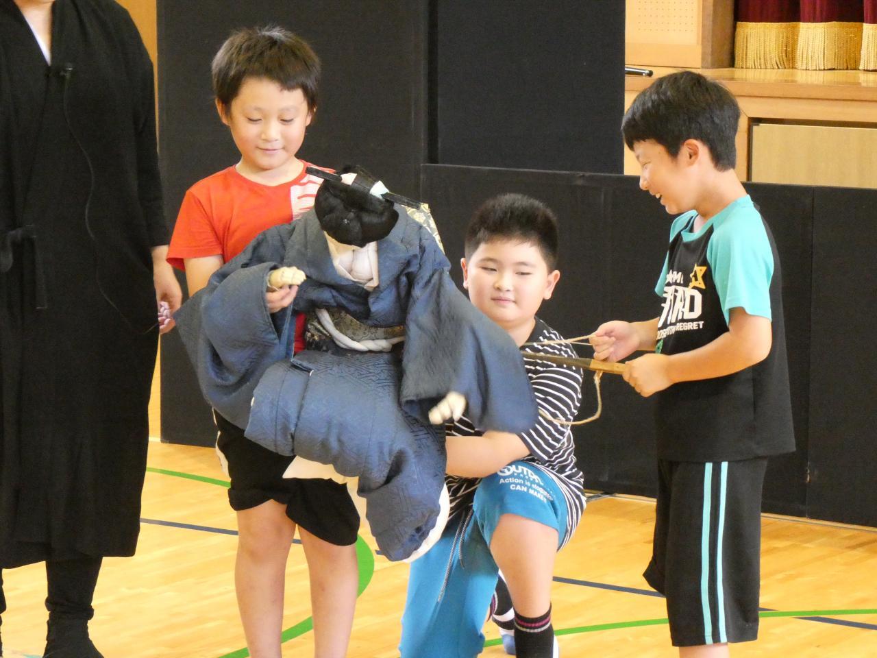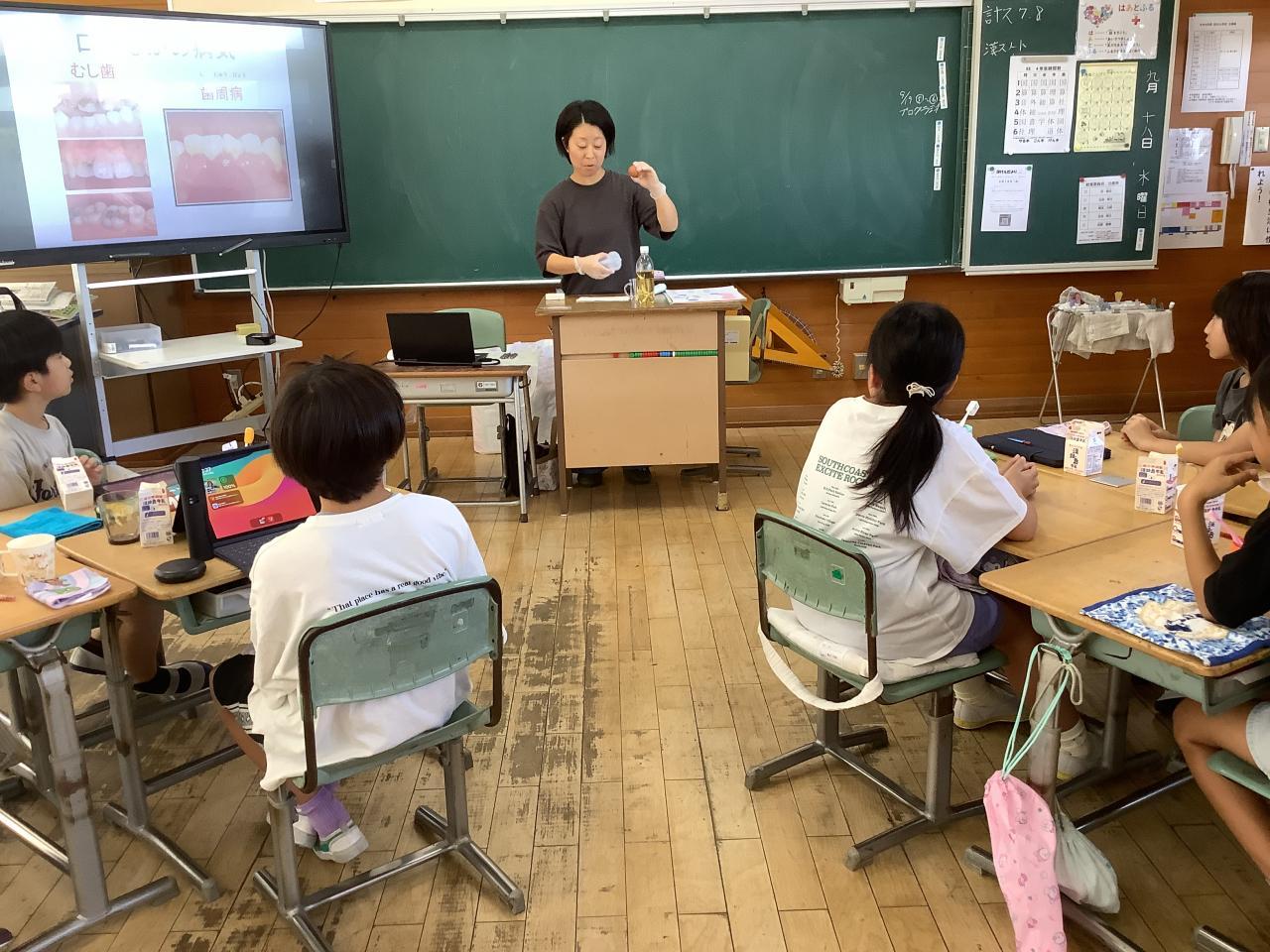 9月17日(火)ふるさと創造学習の一環で、2・3年生を対象に淡路人形座のみなさんの出前授業がありました。はじめに「生写朝顔日記 大井川の段」を見せていただき、それから「太夫」「三味線」「人形遣い」それぞれの役割などについてお話を聞きました。それぞれの特徴が分かった後、「戎舞」を見ました。戎さんが2・3年生のために、「宿題なくなりますように!」「給食のデザートが増えますように!」「みんなが健康に過ごせますように!」とたくさんのお願い事をしてくれました。質問にもたくさん答えていただき、楽しい時間を過ごしました。今日は、4年生が歯科保健講座で歯科衛生士さんから、歯の健康についてのお話と正しい歯磨きの仕方について教えてもらいました。口の中の環境が悪いと、虫歯だけではなく、歯周病などの病気につながることを知り、驚きの声も上がっていました。4年生は本日の染出しの写真を持ち帰ります。ご家庭でも歯磨きの仕方などについてお話をしていただけたらと思います。