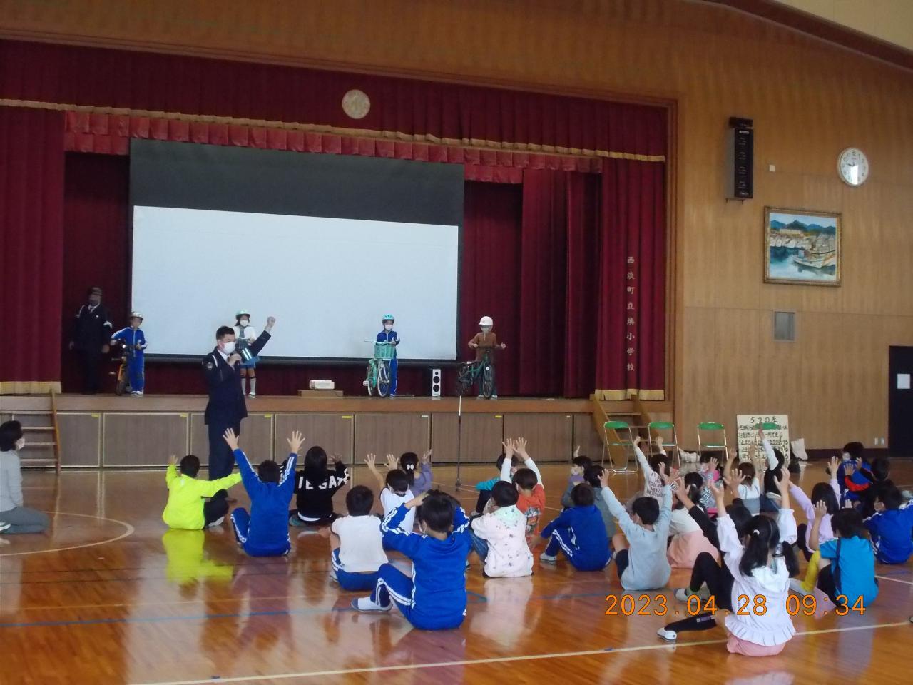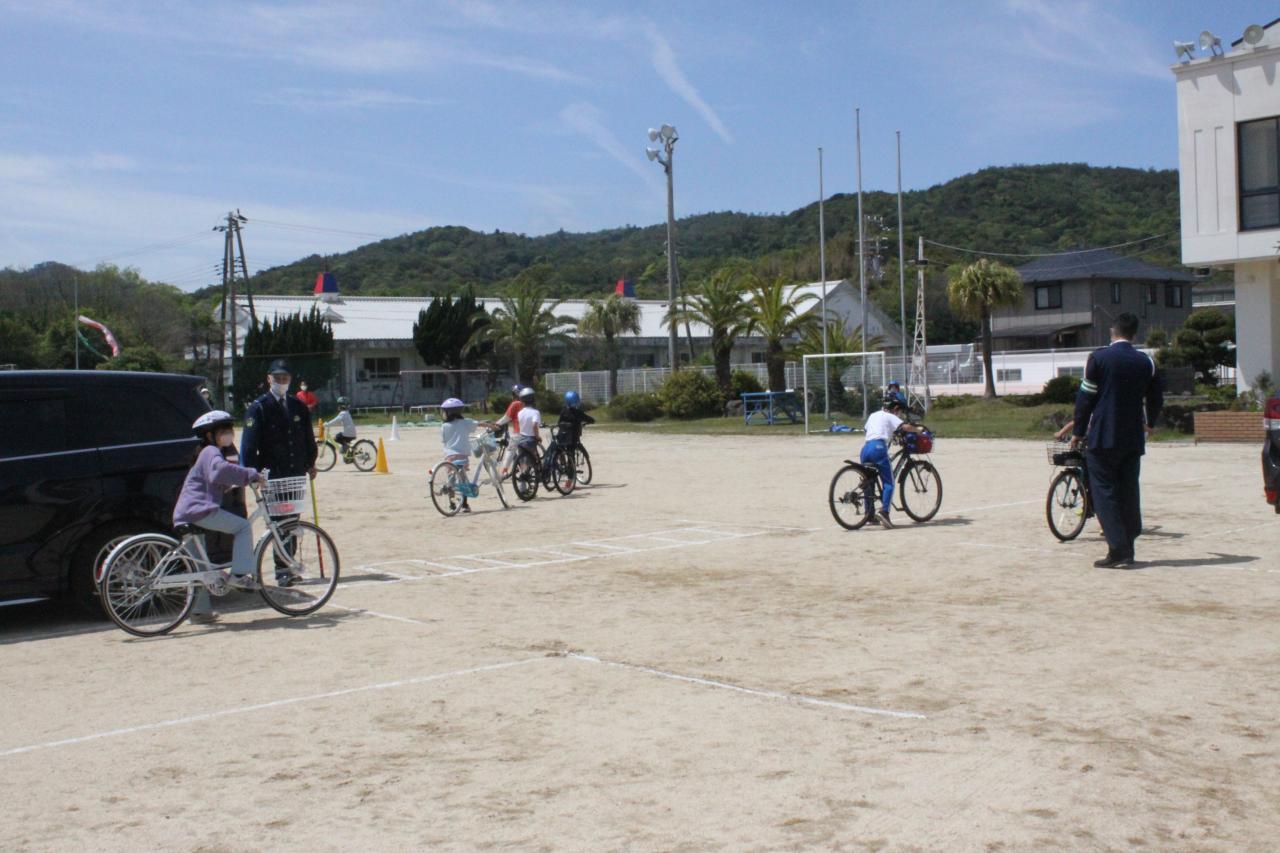 自転車交通安全教室 4月28日(金)全校児童を対象に交通安全教室を行いました。講師に南あわじ警察交通課より2名、南あわじ市交通安全指導員2名に来ていただき、自転車の乗り方を中心にした交通安全のお話やDVDを見せていただきました。その後、3.4年生は自転車教室を運動場で行いました。児童は、真剣にお話を聞き、自転車も頑張って乗り方を学びました。これから、自転車を乗る機会が増えると思います。自分の命を守ることが一番大切ですが、運転の仕方を誤れば他の人を傷つけることもありますので、ご家庭でも交通安全のお話をしていただけますよう、よろしくお願いします。