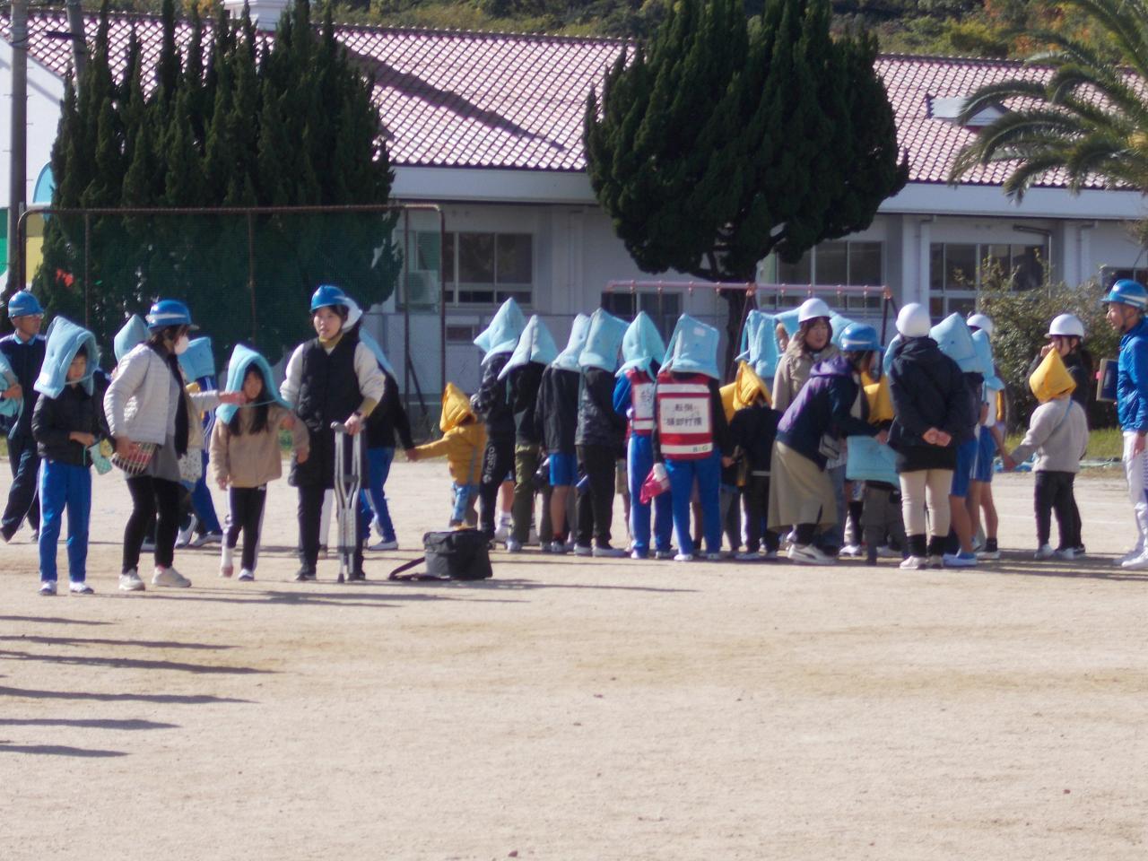 今回は、6年生が2人が不明になったことにして、教職員が探しに校舎へ戻ったり、松葉杖の児童に車いすを用意しての避難でした。緊張した面持ちで幼稚園児と手をつないで行きました。