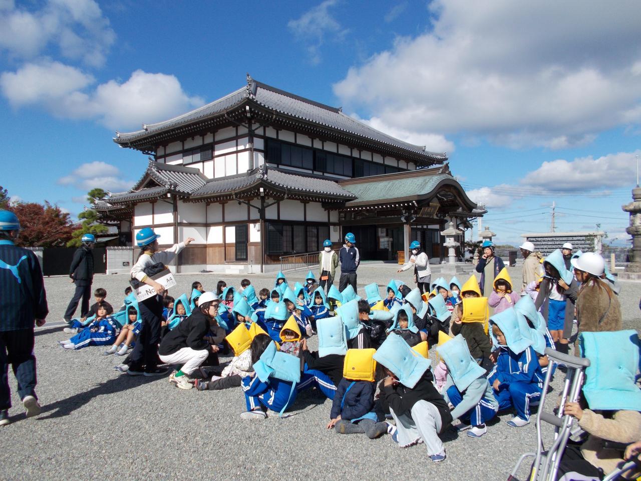 南海トラフ大地震を想定して津波が20メートルより大きいまたは学校が崩れたり、火災になったときを想定して第2次避難所「智積寺」へ幼稚園児とともに行きました。湊への津波到達の想定は1時間10分ごと言われています。