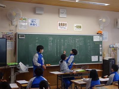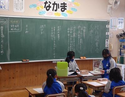 登校班の反省、冬休みの生活について、東津井、西津井、阿那賀、丸山、伊加利の5つに分かれて、校外児童会を行いました。