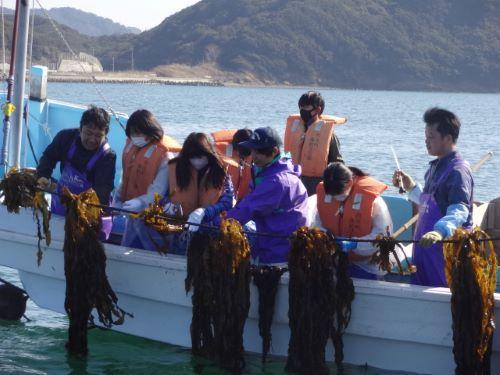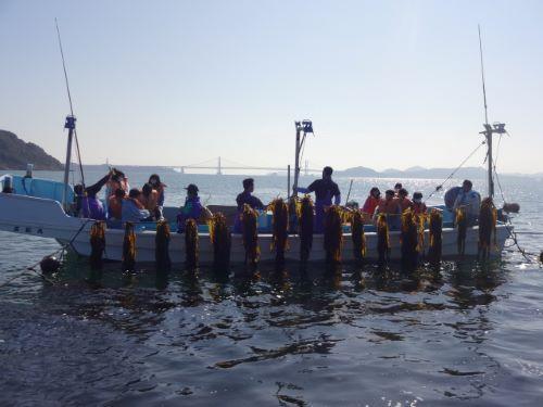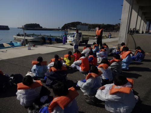 救命胴衣を着け、漁港で説明を受けた後、2隻の船に乗り込んで、漁港沖のわかめの養殖場所に向かいました。
