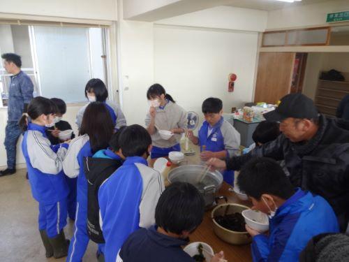 漁港に戻ってきた後、刈り取ったばかりのわかめを、しゃぶしゃぶで試食させていただきました。