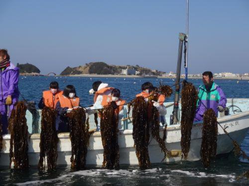 本日13日(火)13:00に、5年生が学校を出発し、丸山漁協の方々にお世話になり、わかめ刈り体験を行いました。