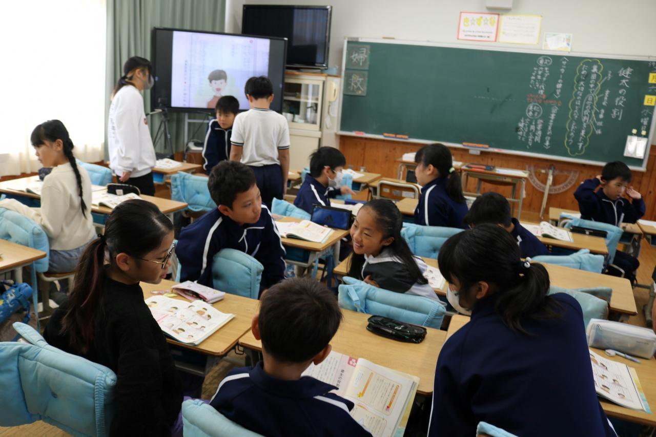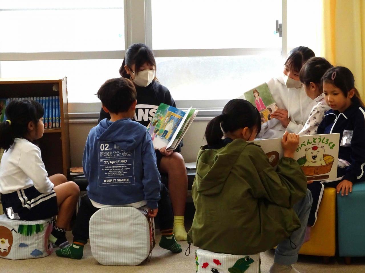 先週の読書週間には、リーディングバディーという活動を行いました。バディーを組み6年生が1年生に読み聞かせを行います。読む場所は、自由です。図書室以外に出かけていくペアも多くいました。とても、素敵な光景が見られました。(写真参照)