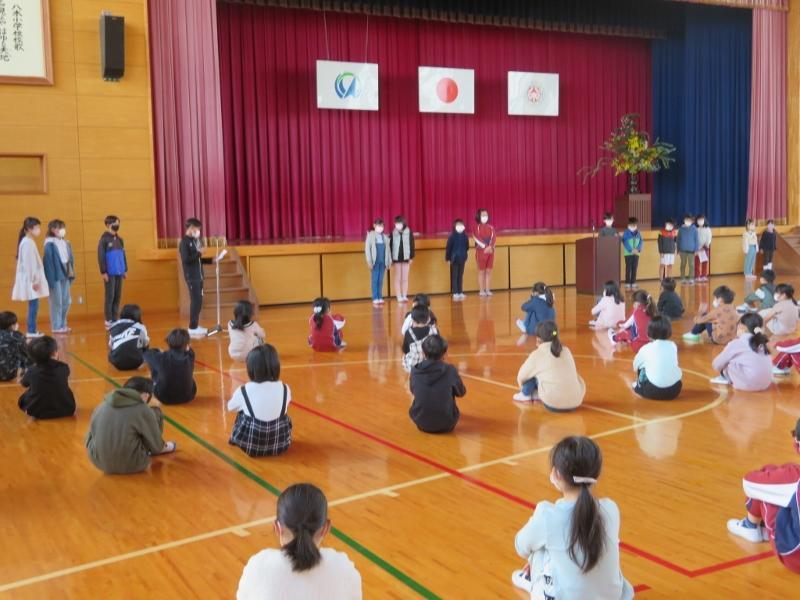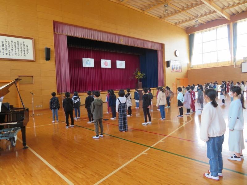 1年間、楽しい学校生活を送ることができましたか。コロナの影響で学校行事が縮小されることが多かったですが、活動が限られた中で、みなさんはできることを精一杯頑張っていました。10月から12月までは、コロナの感染も収まり、校外学習に行く学年が多く、毎日のように大型バスが中庭に入っていました。校長先生も同行する機会がたくさんあり、みなさんの楽しそうな笑顔を見ることができて、とてもうれしかったです。来年度は、コロナが収まっているかわかりませんが、様々な学びや体験活動を通して「なりたい自分」を見つけてほしいと思います。卒業式でも言いましたが「なりたい自分」を見つけた人は、信じられないほどのエネルギーが出て、夢や目標をかなえる人になります。《中略》最後になりましたが、今日おうちに帰って、通知表を渡すときには『一年間ありがとう』とお礼を言って渡してください。みなさんは一人で学校に通っていたのではありません。おうちの人がいろいろとお世話をしてくださったから、元気に学校に通ってこられたのです。『ありがとう』忘れないようにしてください。それでは、よい春休みを過ごしましょう。