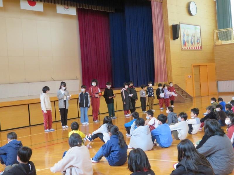 終業式 2学期も終わり冬休みがやってきました。そして、令和4年がもうすぐ終わります。みなさんにとってどんな一年でしたか。昨年に引き続き、良いことも悪いことも歴史に残る一年だったと思います。その中にありながら、児童たちはできることを精一杯、頑張っていました。その頑張りを体育会やオープンスクールなどで保護者の皆さんに見ていただいたことは、大変よがったと思います。