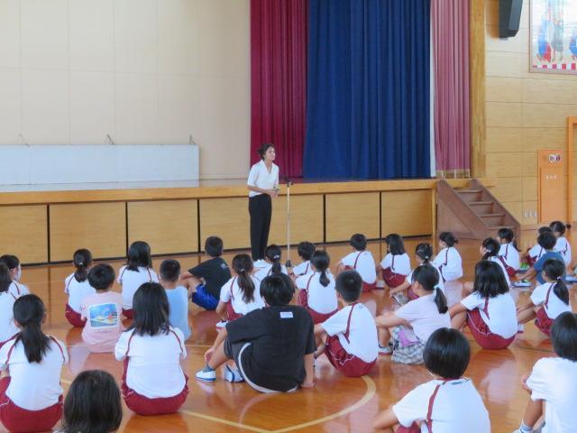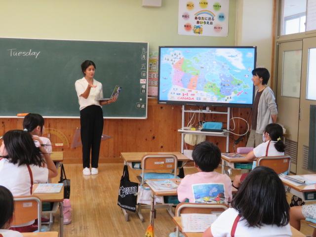 今日から新しいALTの先生との学習が始まりました。今朝の児童集会で全校生に紹介をしました。各教室では、先生から自己紹介がありました。カナダから来られたので、地図を見せながら場所を教えてくれました。また、住んでいた町のことや好きなもの、家族のことなどを子どもたちにもわかる英語でお話ししてくれました。写真や動画なども見せてくれたので、とても分かりやすかったです。子どもたちも興味をもって様々な質問をしました。英語で質問をすることもできました。前任のALTの先生の時と同様に、これからも毎週の外国語の時間が楽しみです。