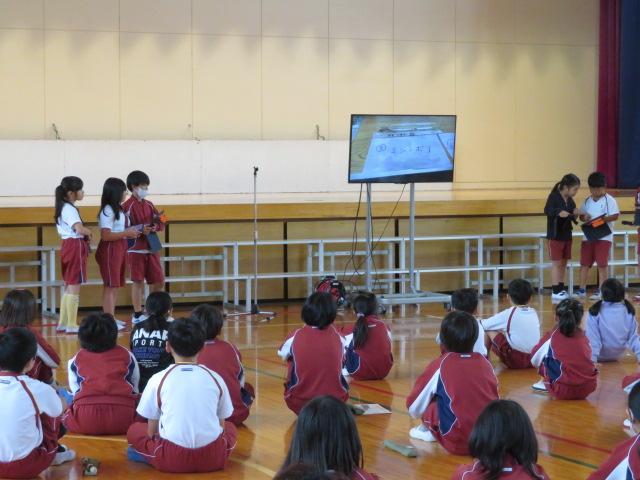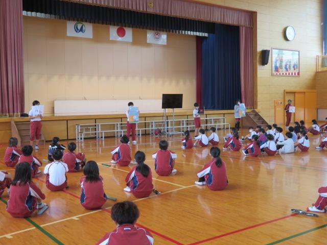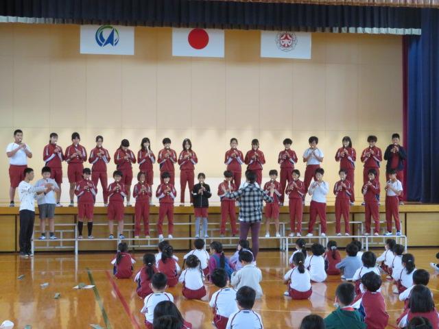 3年生・6年生の発表もありました。3年生は、環境体験活動で学んだことの紹介でした。池、川、磯の生き物についてクイズや映像なども交えながらわかりやすく説明できました。6年生は音楽発表をしました。明日行われる「なかよし音楽会」に向け、全校生に演奏を聴いてもらいました。優しいリコーダーの音色が体育館に響き、とても素敵なひと時をみんなで共有できました。明日の音楽会でもしっかりと演奏してきてほしいですね。
