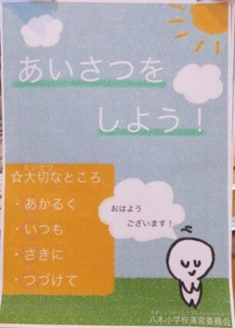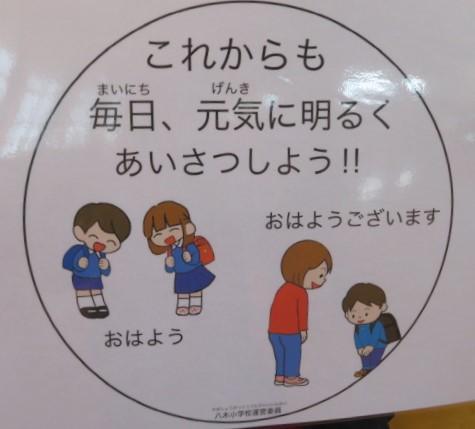 今朝の児童集会では、児童会運営委員より「あいさつ運動」のお知らせがありました。運営委員で作成したポスターとあいさつシールの紹介がありました。全校生みんなでチャレンジをして、あいさつのできる八木っ子を目指してほしいと思います。