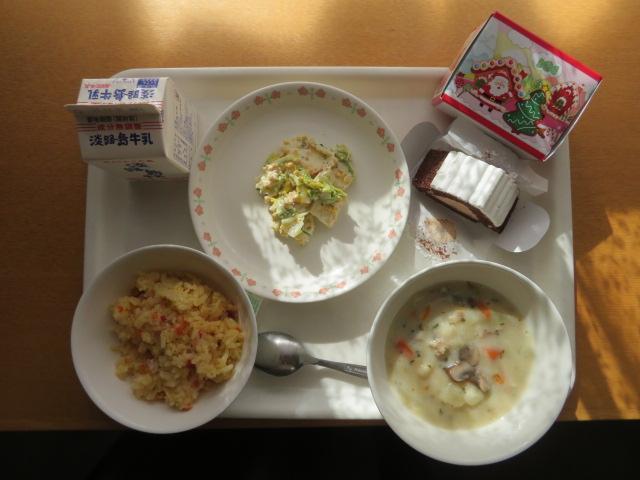 今日の給食の時間、サンタさんが教室にクリスマスケーキを届けてくれました。 実は、保健給食委員会の子どもたちの活動です。サンタクロースの衣装や帽子をかぶり、鈴を鳴らしながら配ってくれました。一足早いクリスマス気分を味わうことができました。今日のメニューは、「キャロットピラフ・ブロッコリーのクリーム煮・白菜とリンゴのサラダ、クリスマスケーキ」でした。ブロッコリーのクリーム煮に、星形のニンジンが入っていた子どもたちもいて、「ラッキー!」という感じでした。食べることは生きていくうえでとても大切なことです。いろいろな食材を食べてどんどん成長してほしいですね。これからも食べることが楽しくなるような取組ができればと思います。