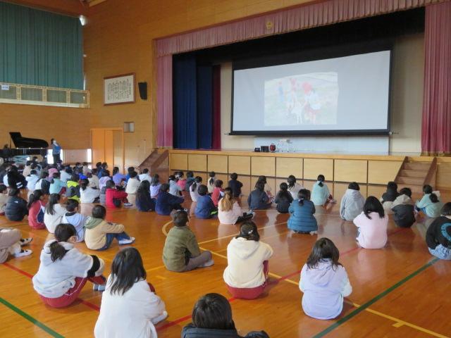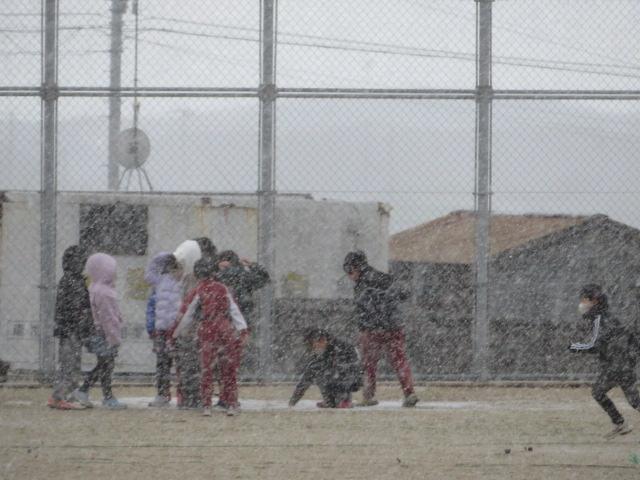 終業式では、1学期と同じように映像で2学期を振り返りました。一人ひとりが、「あの時は楽しかったなぁ」「がんばったなぁ」「もっとやりたかったなぁ」などいろいろなことを思い出してくれたことと思います。振り返りをすることで、「次は〇〇にチャレンジしてみたいな。頑張りたいな。」という思いが生まれます。3学期も「チャレンジ~みんなが主役~」をめざして頑張ってほしいと思います。終業式が終わって外を見ると雪が降っていました。子どもたちは大喜び。雪が降っている間、運動場に出てうれしそうに遊ぶ姿が見られました。