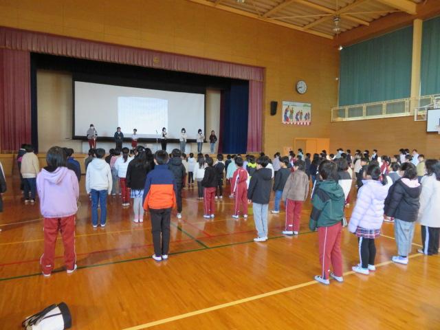 意見発表では、各クラスの代表が2学期に頑張ったことや3学期に頑張りたいことなどを発表しました。全校生の前で自分の意見を述べるというのは、とても緊張するものです。でもその経験が、きっとこれからの生活に生きてきます。これからもチャレンジしてほしいですね。