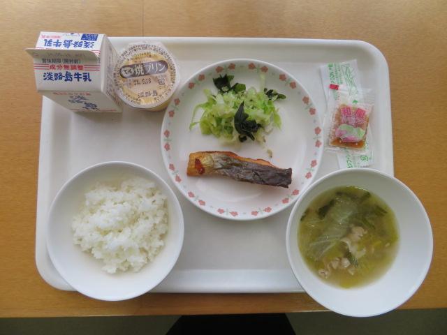 毎日おいしくいただいている給食。今年度も「学校給食地場食材利用拡大事業」より市内産食材が提供されます。今日の献立は、「サクラマスの塩焼き・南あわじの旬サラダ・えびすもち豚とレタ麦スープ・淡路島焼きプリン」でした。給食だよりを見ると、今日の給食には、たくさんの市内産食材が使われていることがわかります。南あわじ市は本当にいろいろな食材が豊富です。生産者の皆さんや給食を調理してくださっている皆さんに感謝しながらおいしくいただきました。