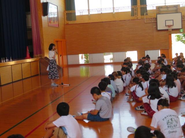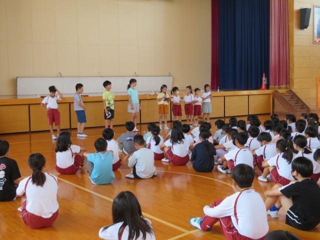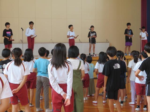 音楽集会では、7月の歌「マーチングマーチ」を歌いました。今日はいつもよりさらにいい声で歌えていました。また、音楽委員さんによるハンドベル演奏「ミッキーマウスマーチ」を聴きました。ハンドベルの音色が心に響くステキな演奏でした。全校生から自然と拍手が起こりました。一生懸命練習した努力のたまものですね。意見発表会では、子どもたちが1学期に頑張ったことなどを堂々と発表していました。代表の子どもたちだけでなく、全校生みんなが、それぞれに頑張ったことがあります。終業式の中でも、1学期を振り返って「みんな頑張ってたね」という話と「夏休みも何かチャレンジすることを見つけて頑張ってほしい」ということなどを話しました。詳しくは、子どもたちに聞いてみてくださいね。
