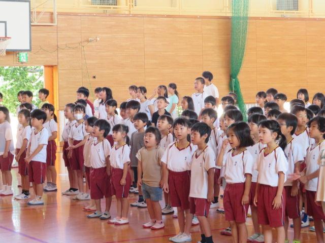 この4か月を振り返ってみると、毎日の教室での学習だけでなく、体育会や地域へ出かけての学習などたくさんのことにチャレンジしている姿がありました。成功したかどうかではなく、その時その時を大切に、一生懸命 頑張った ということが素晴らしいことなのだと思います。今日は、通知表を持ち帰ります。1学期を振り返り、頑張ったこと、もう少し頑張りたいことなど、一緒にお話ししてください。そして、頑張りを認め、ほめてあげていただければと思います。それが、次への意欲につながります。 子どもたちがこのように頑張れたのも、保護者の皆様の温かい支えがあったからこそだと思います。学校の教育活動にご理解ご協力いただき本当にありがとうございました。