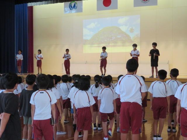 今月の歌は「この木なんの木」でした。テレビからよく流れていたCMソングなので、ご存じの方もたくさんいらっしゃると思います。音楽委員会の子どもたちはスズやウッドブロックなどの楽器でリズムを奏でたり、舞台の壁に大きな木の映像を映し出したりと工夫していました。毎月、音楽集会のために昼休みなどの時間を使って練習をしています。目的をもって取り組む姿は素敵ですね。来月はどんな音楽集会になるのか楽しみです。