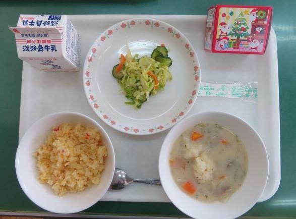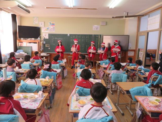 今日のメニューには、「クリスマスケーキ」がついていました。給食の時間にサンタさん(保健給食委員会の子どもたち)が届けてくれました。もうすぐクリスマス。楽しみにしている子どもたちもたくさんいるのでは?