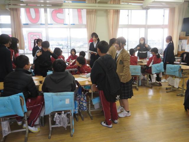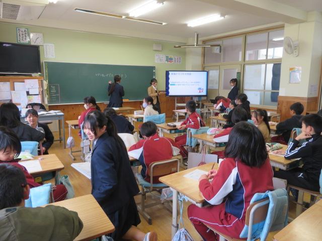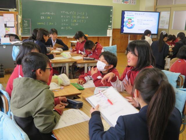 5時間目に5年生が防災学習に取り組みました。今回は、舞子高校の高校生による出前授業でした。南海トラフ地震について、阿万海岸では?八木では?とクイズ形式で教えてくれました。また、「もし、阿万海岸に家族で遊びに来ているときに南海トラフ地震が起きたら?」「もし、一人で家にいるときに地震が起きたら?」というワークショップを行いました。それぞれの班で、子どもたちは一生懸命どうすればよいかを考えていました。「もしも・・・」と考えることはとても大切ですね。非常持ち出し袋に何をいれるかについても考えました。必要なものは人によって違います。また、一人で持てる重さには限りがあります。どんな準備をしておけばよいのか、どこに避難すればよいのかなど、改めて家族で考えてみたいですね。高校生と一緒に学ぶことができ、とても良い経験になりました。