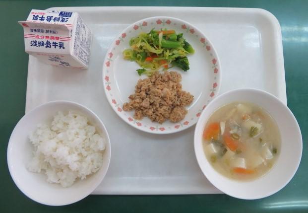今日の給食は、「南あわじ市の四季を感じる学校給食」でした。メニューは、「牛乳、鯛そぼろ丼、菜の花のおひたし、みそ汁」でした。市内産、地場産食材として米・牛乳・鯛そぼろ(鯛のほぐし身)・菜の花・キャベツ・にんじん・豆腐・大根・油揚げ・玉ねぎ・ねぎが学校給食地場食材利用拡大事業より提供されています。鯛そぼろ丼は、新メニューだそうです。給食だよりにも作り方が掲載されていました。今日もおいしくいただきました。