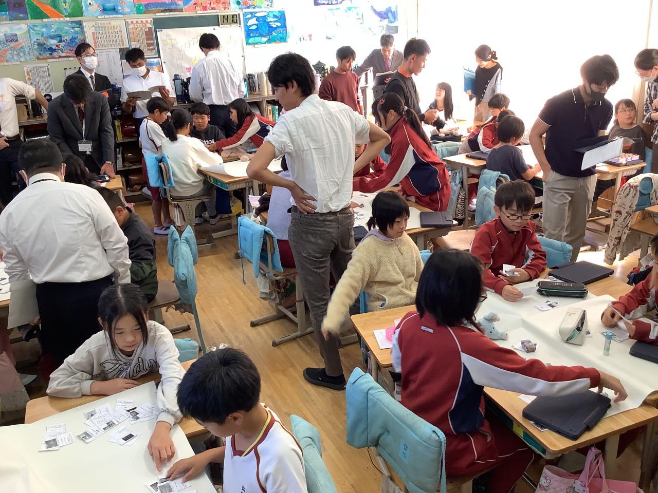 30日は、5年生の防災の授業でした。こちらも大学の先生の他、市内各小中学校から先生方に見ていただきました。阪神淡路大震災のたくさんの映像資料から、各自で被害や困り事をカードに書き出した後からの授業でし
