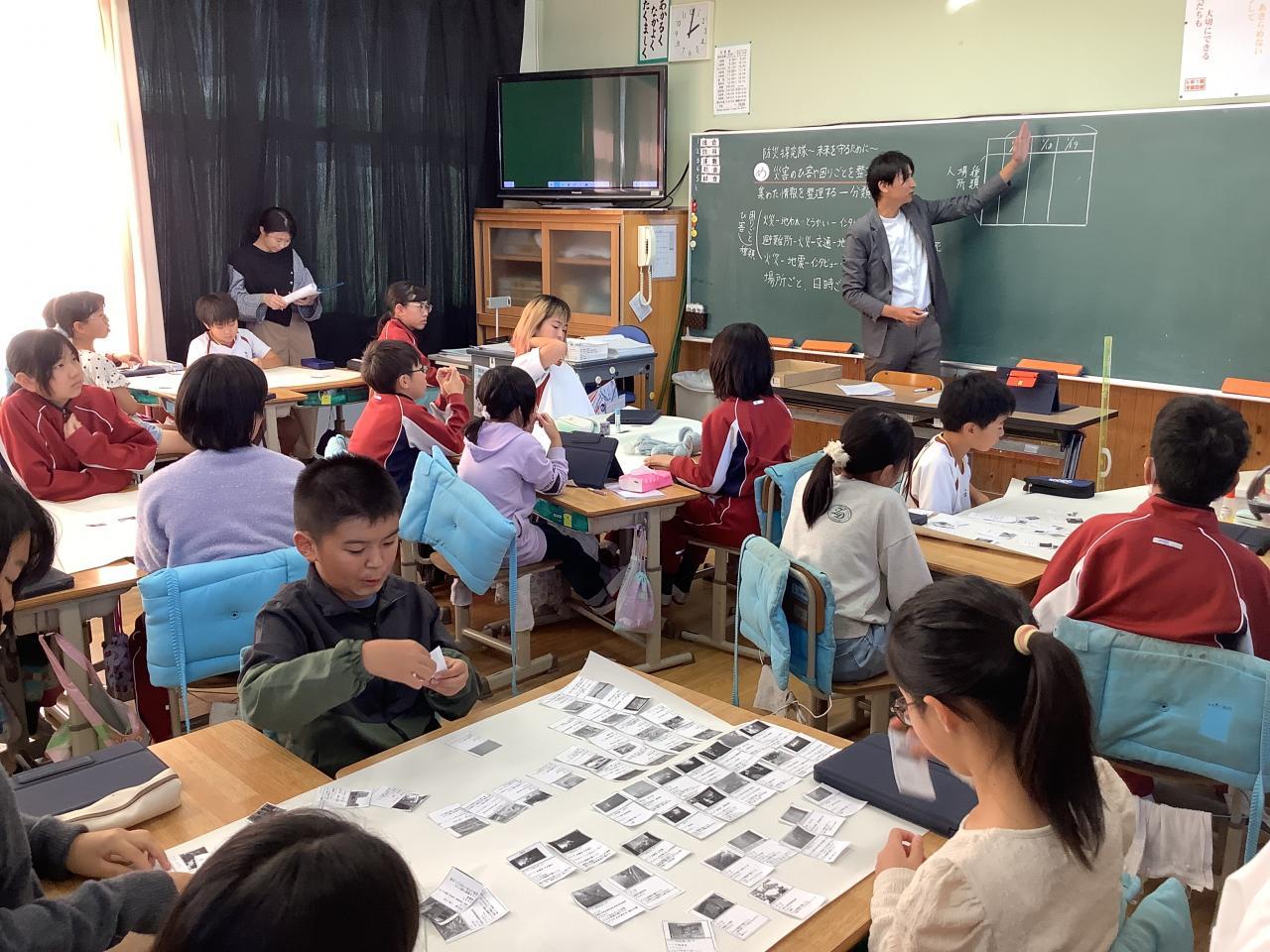 た。それをグループごとに、KJ法でわかりやすく整理する方法について考え、防災マトリクスにまとめていくというものです。この文章では、恐らく授業のイメージが分かりにくいと思いますが、学級の各グループで「これはこう思う」「こうしたら・・・」「こっちの方が・・・」などとわいわいがやがやとやっている状態です。子どもたちは課題にしっかりと向き合って、集中して取り組めていました。(写真3・4枚目)
