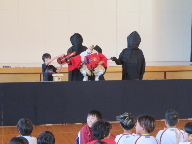 奥が深いですね。子どもたちは興味津々で見ていました。最後の「戎舞い」には、3年生から代表1名が参加し、お酒を注ぐ役までさせていただきました。2時間たっぷり、淡路人形浄瑠璃に浸ることができました。