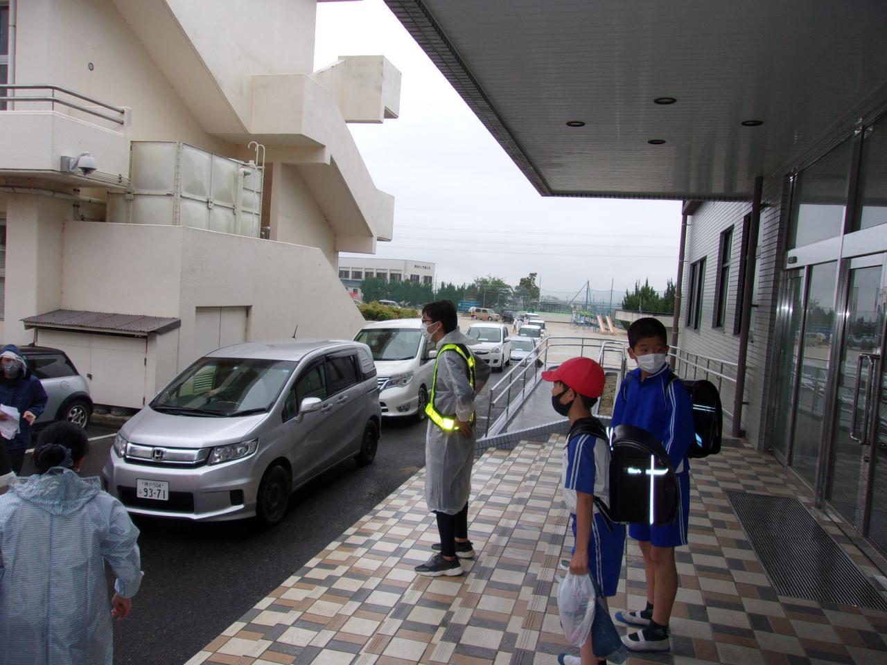 今日は、引き渡し訓練にご協力いただき、ありがとうございました。雨が降る中での実施となったのですが、もしもの時のイメージができ、とても有意義な訓練となりました。道路に車が並ばなくてすむようにと運動場を回るコースにしていましたが、誘導に従って対応していただき本当にありがとうございました。今日の訓練を受けて、より安全な引き渡しができるよう、保護者の皆様に次の3点についてご協力いただきたいと思いますので、よろしくお願いします。
