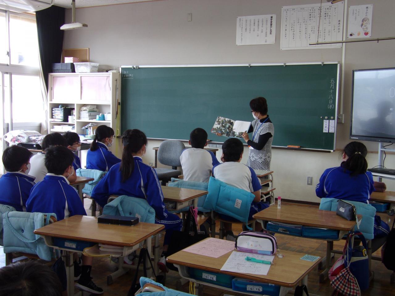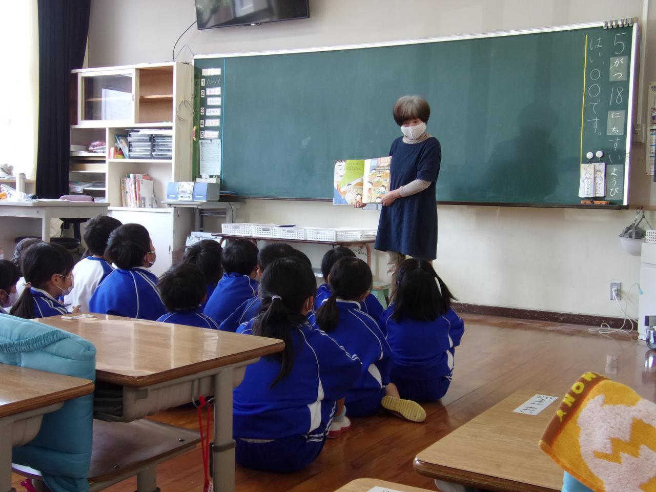 今日は、読み聞かせボランティアのみなさんに 1年1組「わたしのそばで きいていて」1年2組「にわとりのおっぱい」6年1組「玉ねぎの王者ターザン」6年2組「せきれい丸」をそれぞれ読んでいただきました。その他のクラスでは、自分の読みたい本を選んで静かに読む姿が見受けられました。