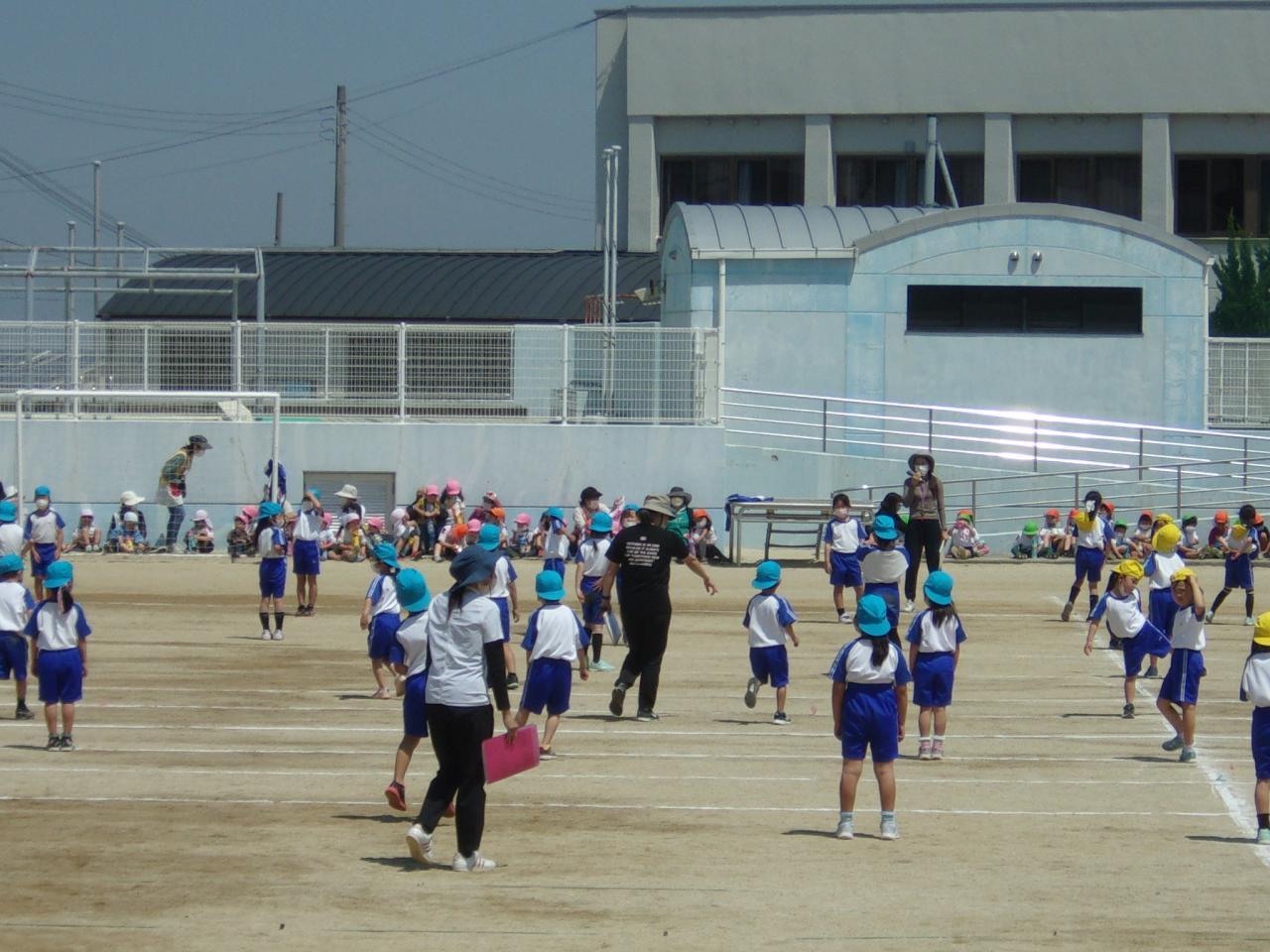 3時間目、市こども園の子どもたちが運動会の練習を見に来てくれました。1・2年生の練習時間だったので、ダンスの様子を見てもらいました。1・2年生の子どもたちは、見てくれるお客さんがいることで、張り切って踊っている様子でした。土曜日の本番に向けて、毎日頑張って練習しています。